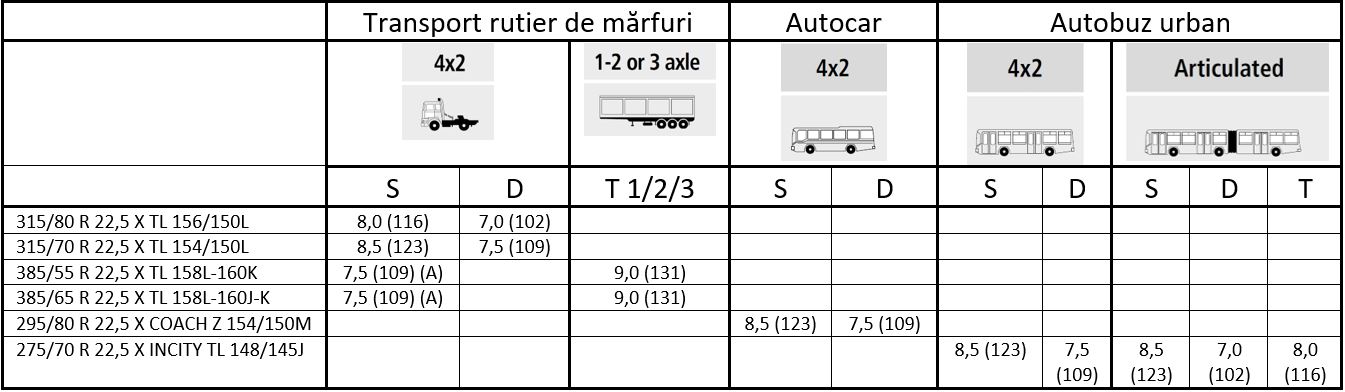 Desigur, acestea nu acoperă toate condițiile de utilizare și trebuie discutate cu reprezentantul dumneavoastră Michelin înainte de a fi date în folosință pe vehiculele dvs.