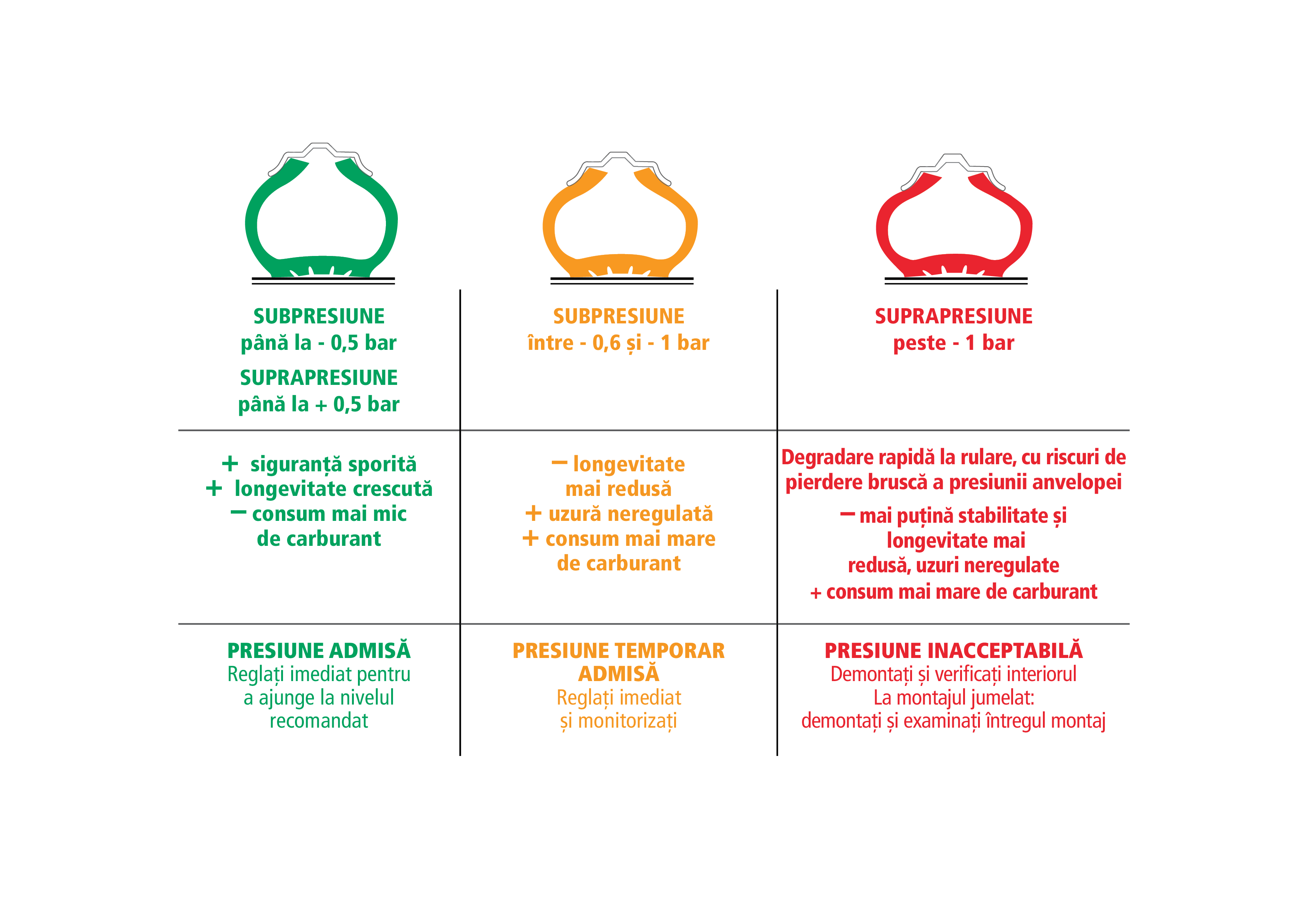 - Presiunea incorectă a anvelopelor are un impact negativ asupra anumitor aspecte de bază ale performanței în materie de siguranță, cum ar fi rezistența carcasei, stabilitatea și manevrabilitatea vehiculului, nivelurile de aderență și tracțiune și sensibilitatea la lovirea bordurilor.