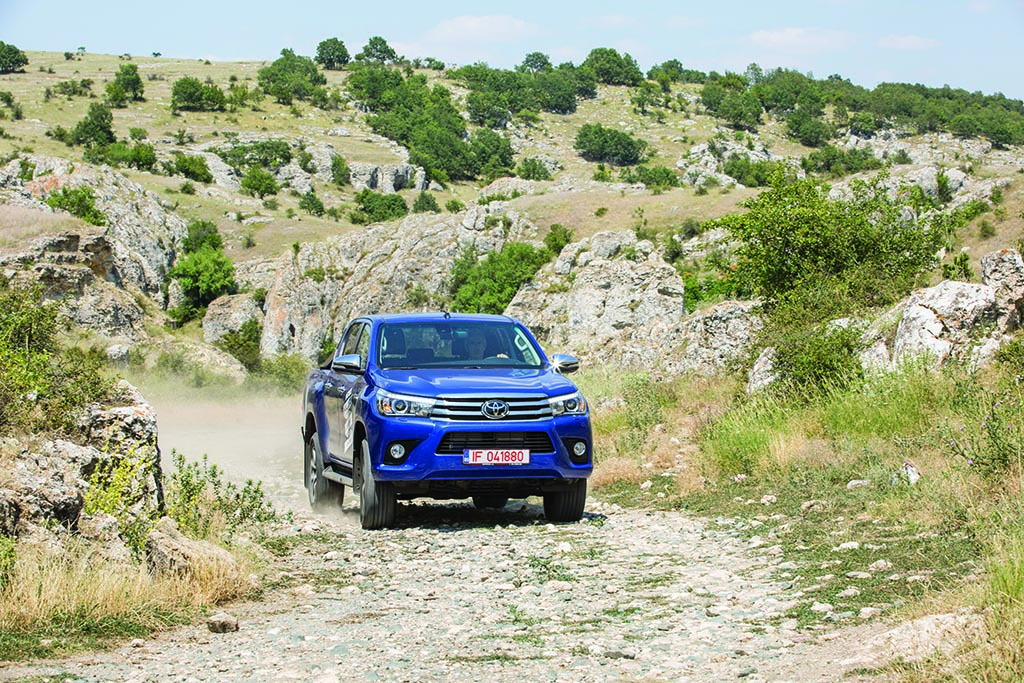 Pe lângă confort, siguranță, durabilitate și capacitate de încărcare, inginerii de la Toyota au îmbunătățit și aptitudinile off-road care erau deja la un înalt nivel. Cursa suspensiei roții a fost mărită cu 20% până la 52 cm, un record în segment, astfel că Hilux se poate aventura și pe stânci fără teama că vei pierde contactul cu solul. Iar garda la sol atinge o valoare impresionantă, de minim 286 mm, unghiurile de atac/ieșire fiind de 31, respectiv 26 de grade. Comenzile pentru sistemul 4×4 sunt grupate la baza consolei. Din butonul rotativ se poate trece de la 4×2 la 4×4 în mers până la 50 km/h, iar pentru condiții grele se poate cupla reductorul la 4x4H, caz în care trebuie să opriți și să cuplați schimbătorul cutiei automate în N. De la un buton apropiat se poate bloca noul diferențial spate cu blocare limitată, care este mai ușor și mai compact și este disponibil la toate versiunile. De asemenea, de la SUV-urile moderne Toyota s-a preluat sistemul de asistare la coborârea pantelor și de asistare la plecarea din pantă. Pe stâncile din jurul Cheilor Dobrogei am testat rigiditatea șasiului și mașina asta pare construită dintr-o singură bucată, dând o mare încredere și o senzație de robustețe pe care nu am mai întâlnit-o la un alt pick-up. Deși garda la sol este puțin mai mare ca în trecut, înălțimea mai mică cu 45 mm decât a predecesorului a condus la obținerea unui centru de greutate mai coborât.