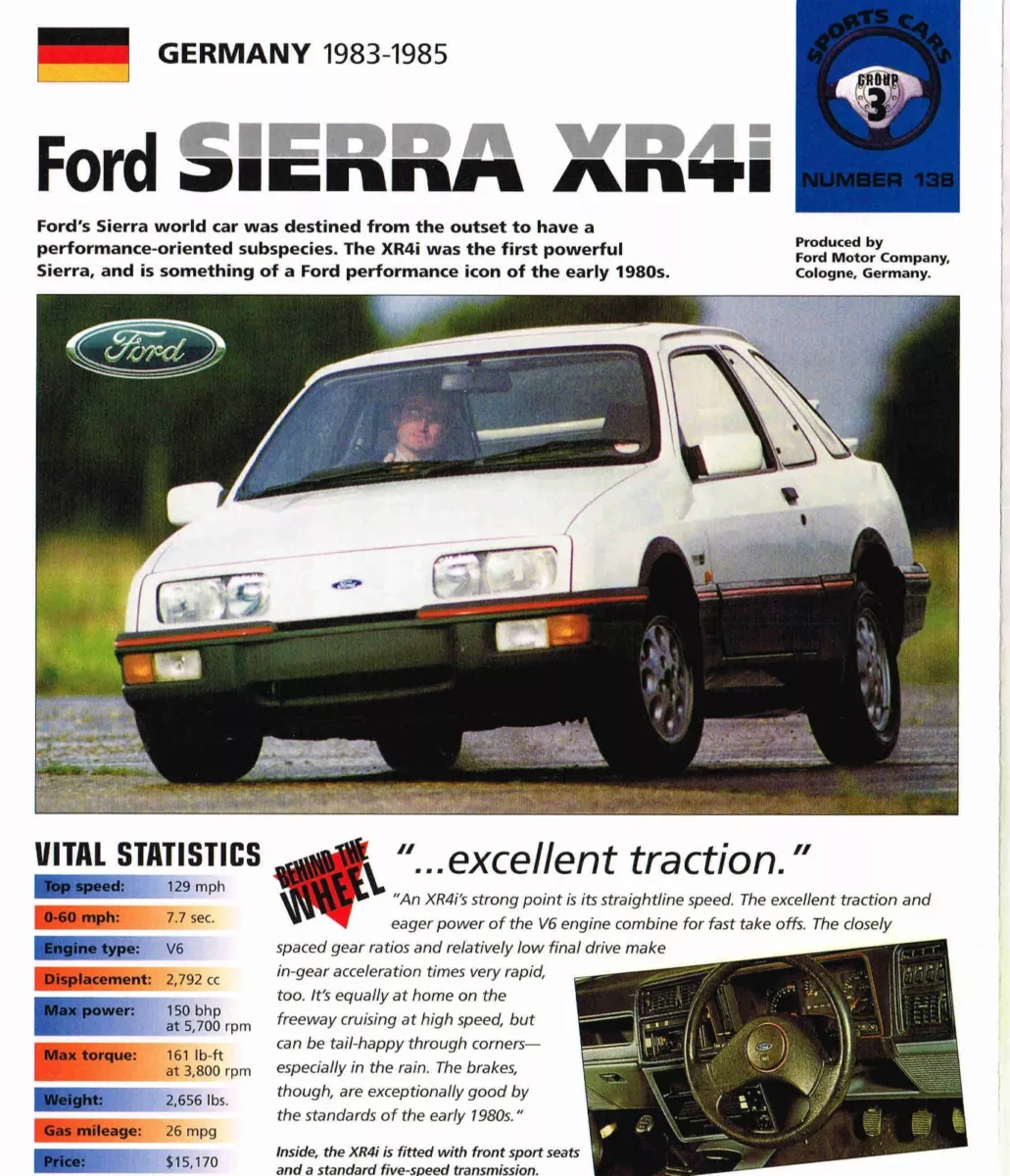 Iar pentru asta există un model mai potrivit, care vine cu un motor mai mare, mai puternic, și cu o arhitectură la fel de nobilă, V6. Ford Sierra XR4i are un propulsor de 2,8 l (deși inițial era gândit să primească motorul 2.3), accelerează decis, dar, deși are bare de torsiune mai groase și amortizoare Bilstein mai tari decât la celelalte versiuni Sierra, nu e o mașină sport, ci mai degrabă un gran tourer. Pe viraje, îi lipsește incisivitatea și nu-i place să fie bruscat. Dar are eleronul acela dublu, și geamurile laterale din spate sunt „rupte“ în două piese distincte, așa că toată lumea va ști că ai o mașină aparte. Și costă mai puțin decât 3-ul.
