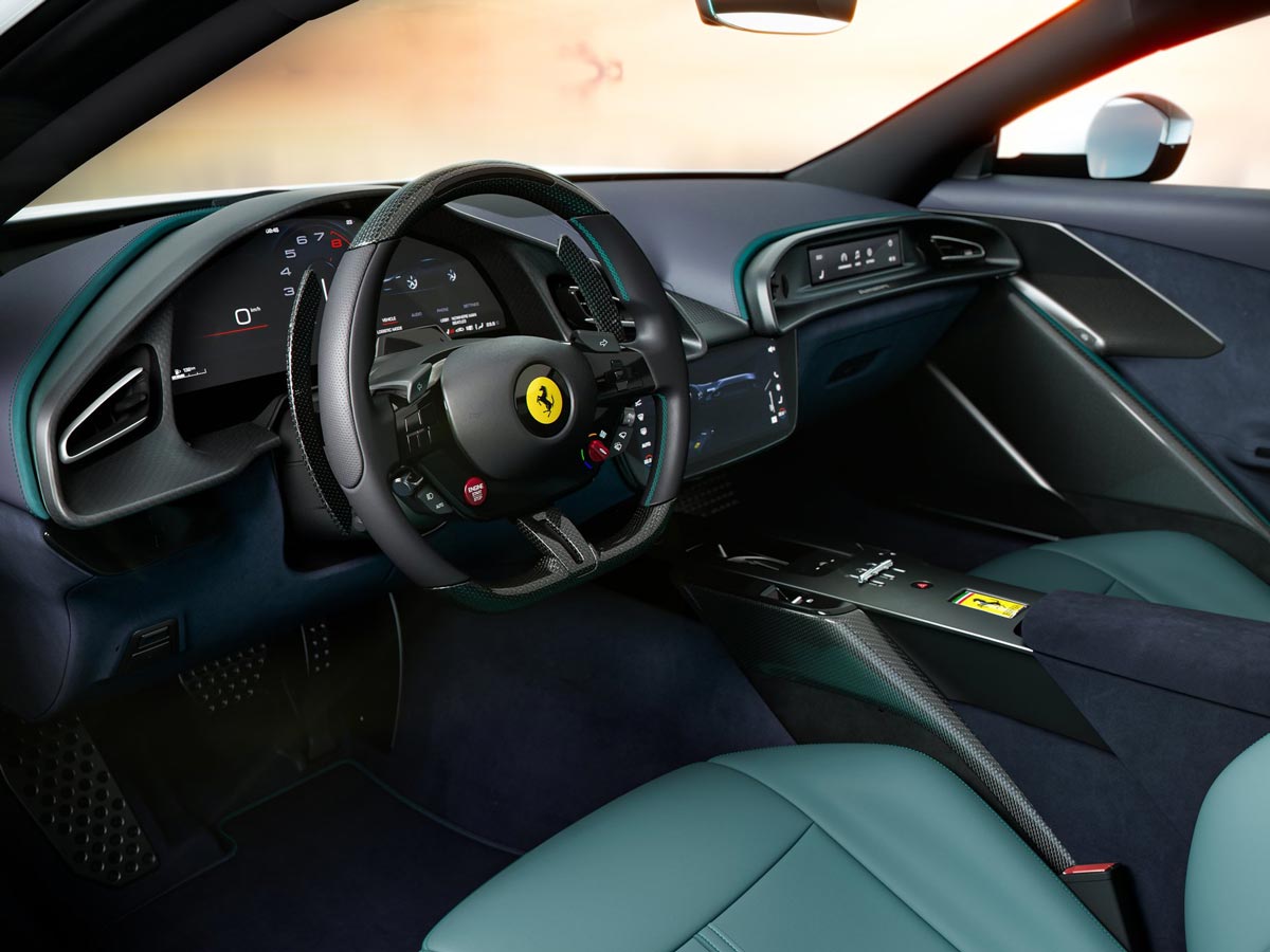 Revenind la Amalfi, acesta beneficiază de prezența unui motor V8 turbo, fără electrificare. Propulsorul dezvoltă 640 CP la 7500 rpm și-i transmite punții spate printr-o cutie de viteze automată cu 8 trepte. Sprintul 0-100 km/h durează 3,3 s, viteza maximă fiind de 320 km/h. Și mai impresionantă este distanța de frânare 100-0 km/h, de 30 m. Mai mult, noul sistem brake-by-wire permite frânarea de la 200 km/h într-o distanță mai scurtă cu 10 m față de cea obținută de fostul model, Roma. În sfârșit, eleronul escamotabil poate apăsa pe puntea spate cu 110 kg, asigurând o aderență optimă.
