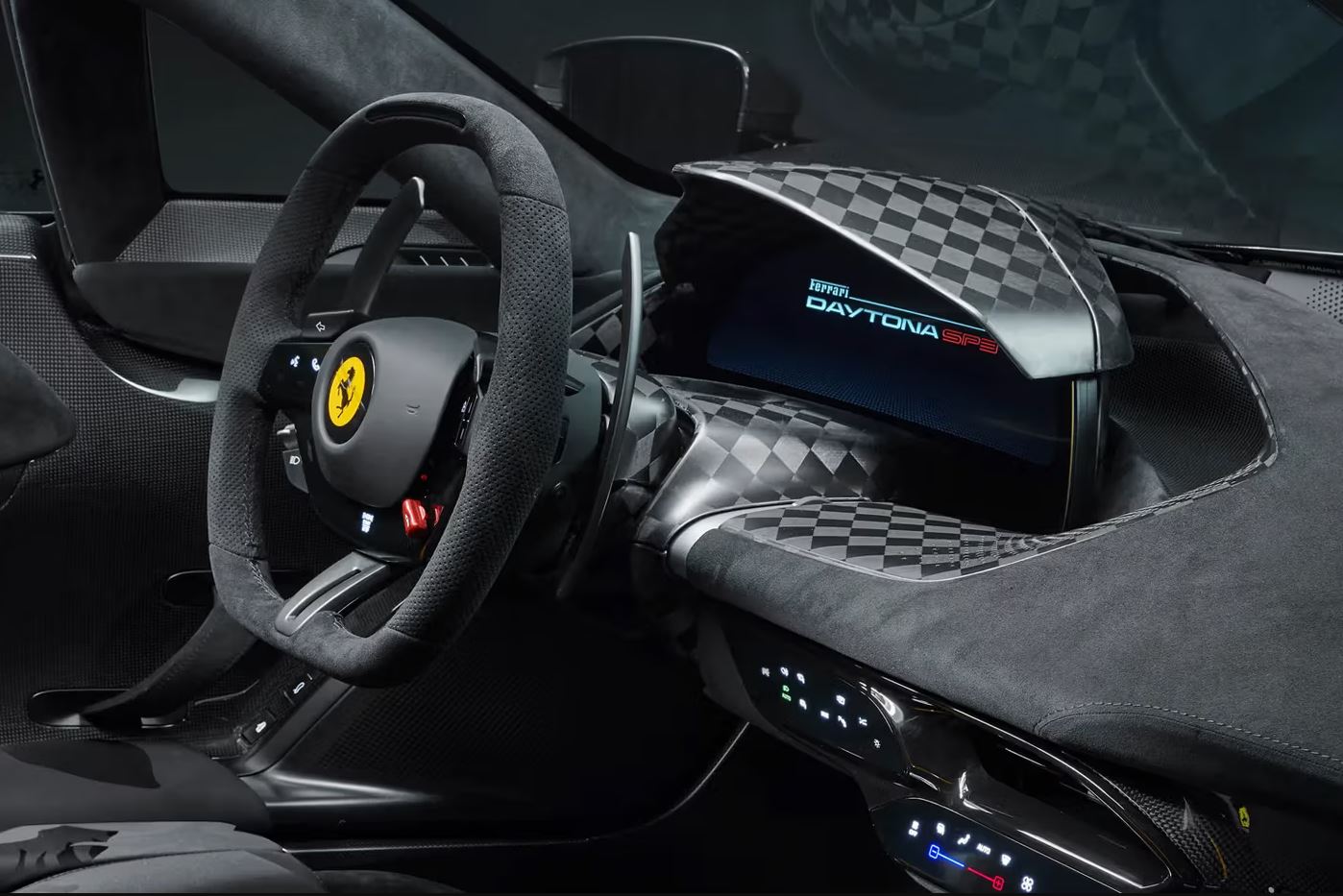 La interior, materialul Q-Cycle, obținut din reciclarea anvelopelor, îmbracă elegant suprafețele. Centurile galbene și emblemele brodate completează atmosfera Ferrari, în timp ce fibra de carbon provenită din monoposturile de Formula 1 aduce un omagiu ADN-ului sportiv al mărcii.