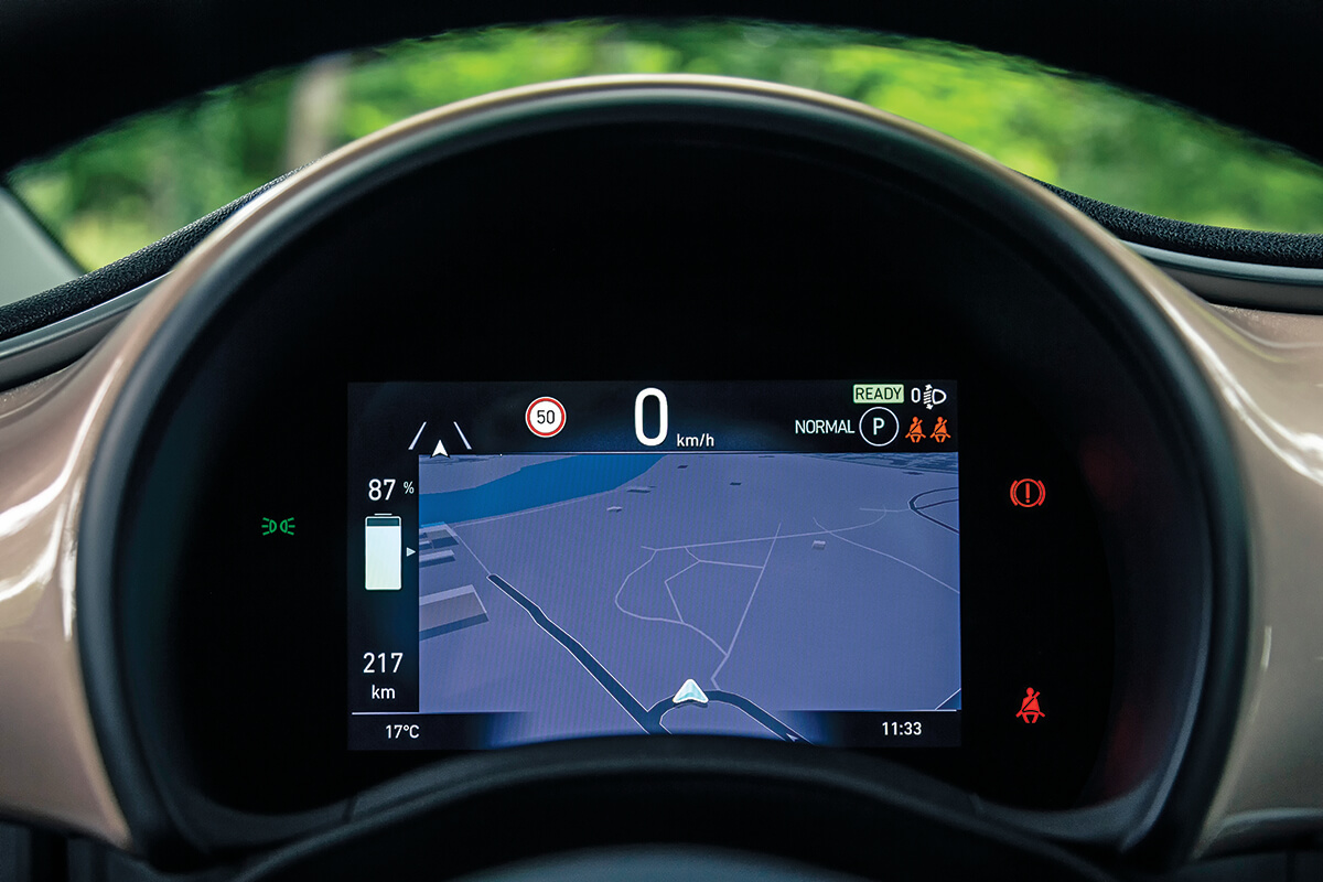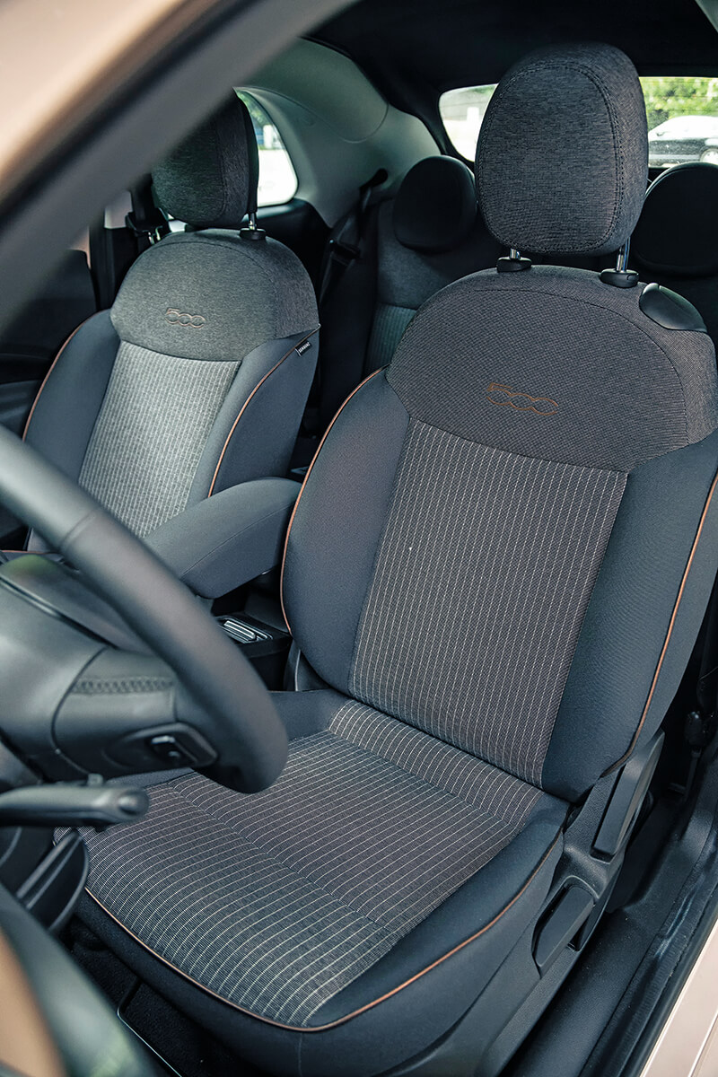 Fiat 500 electric are rădăcinile înfipte mai adânc în istorie. Stră-străbunicul său s-a născut în 1957 și, de dragul lui, mai-mai că-mi vine să renunț la Waze-ul proiectat pe ecranul de 10,25 de inchi, în favoarea hărții tipărite. Volanul cu două spițe mă transportă în perioada postbelică, în care europenii își luau adio de la griji. Scaunul cu aspect retro nu mai are însă legături funcționale cu trecutul, ci te îmbrățișează cu fermitate.