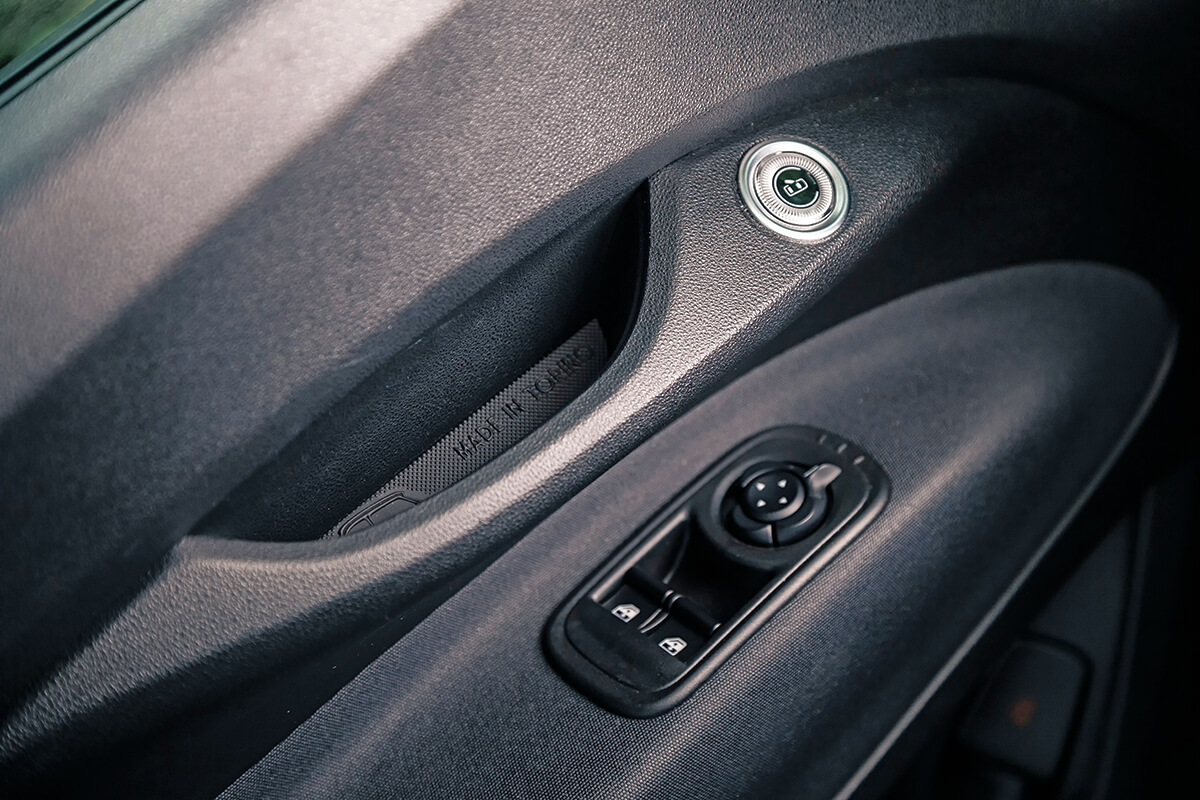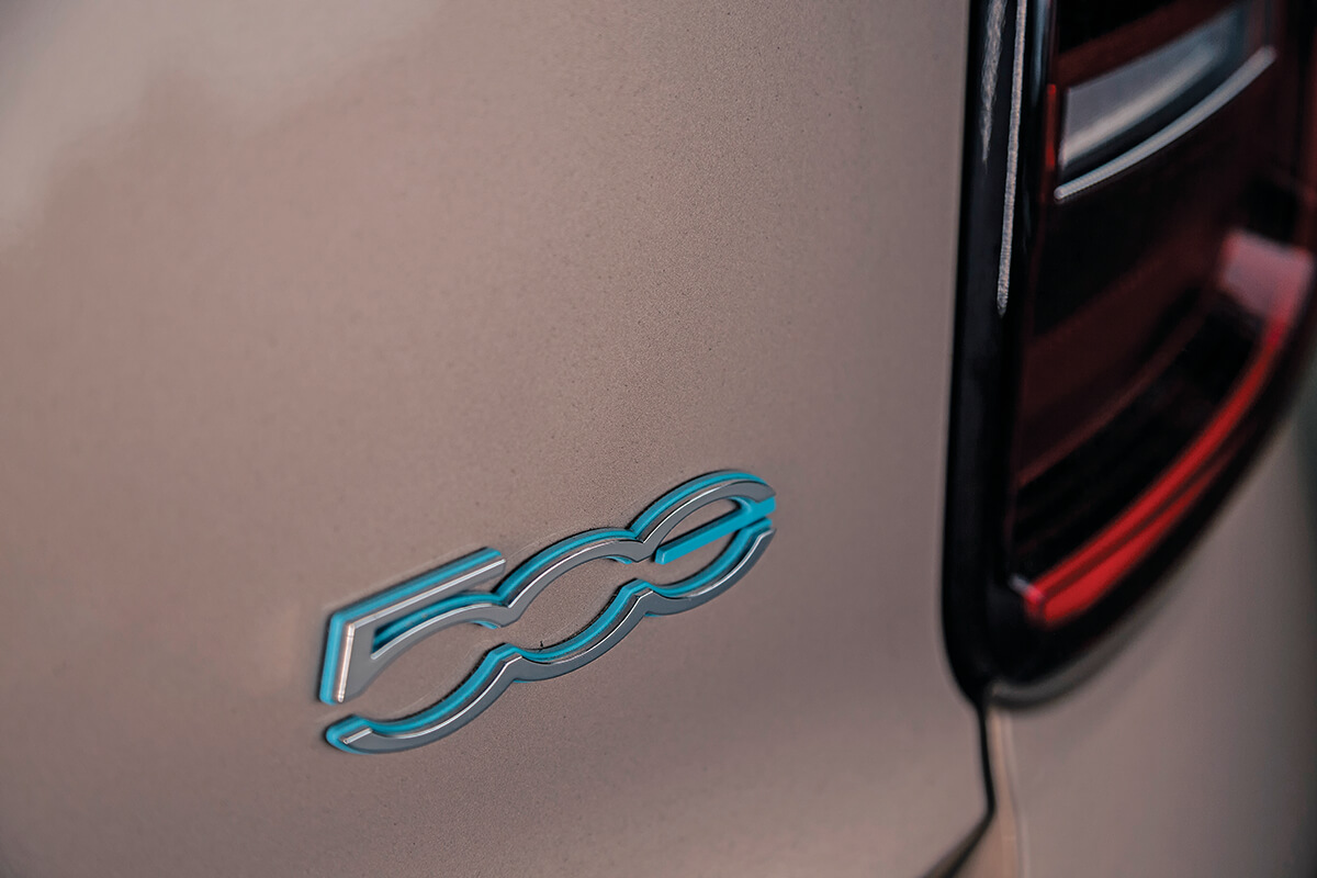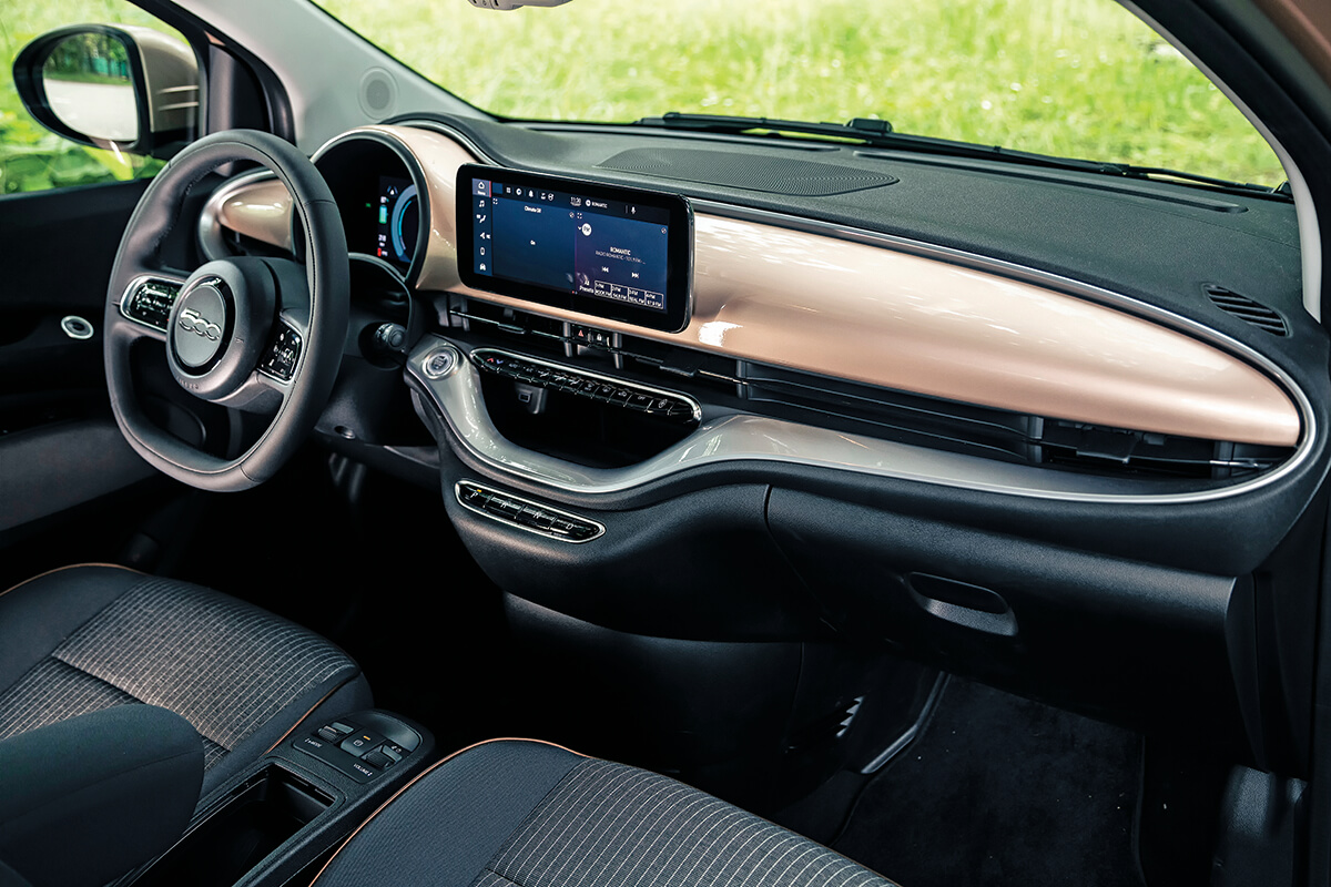 Este remarcabil cum au reușit italienii să creeze o atmosferă premium fără să utilizeze un singur plastic moale pe uși sau bord! S-au jucat cu materiale texturate și lucioase, negre și colorate în nuanța caroseriei, au presărat sigla 500 și au ascuns te miri pe unde sintagma „Made in Torino“. Pare că te afli captiv între trecut și viitor și nu poți scapi decât dacă apeși butonul care deschide ușa. La propriu. Da, Fiat 500 electric are la interior butoane care deschid ușile! Are și manete, dar ascunse în buzunarele ușilor, ca ultimă soluție.