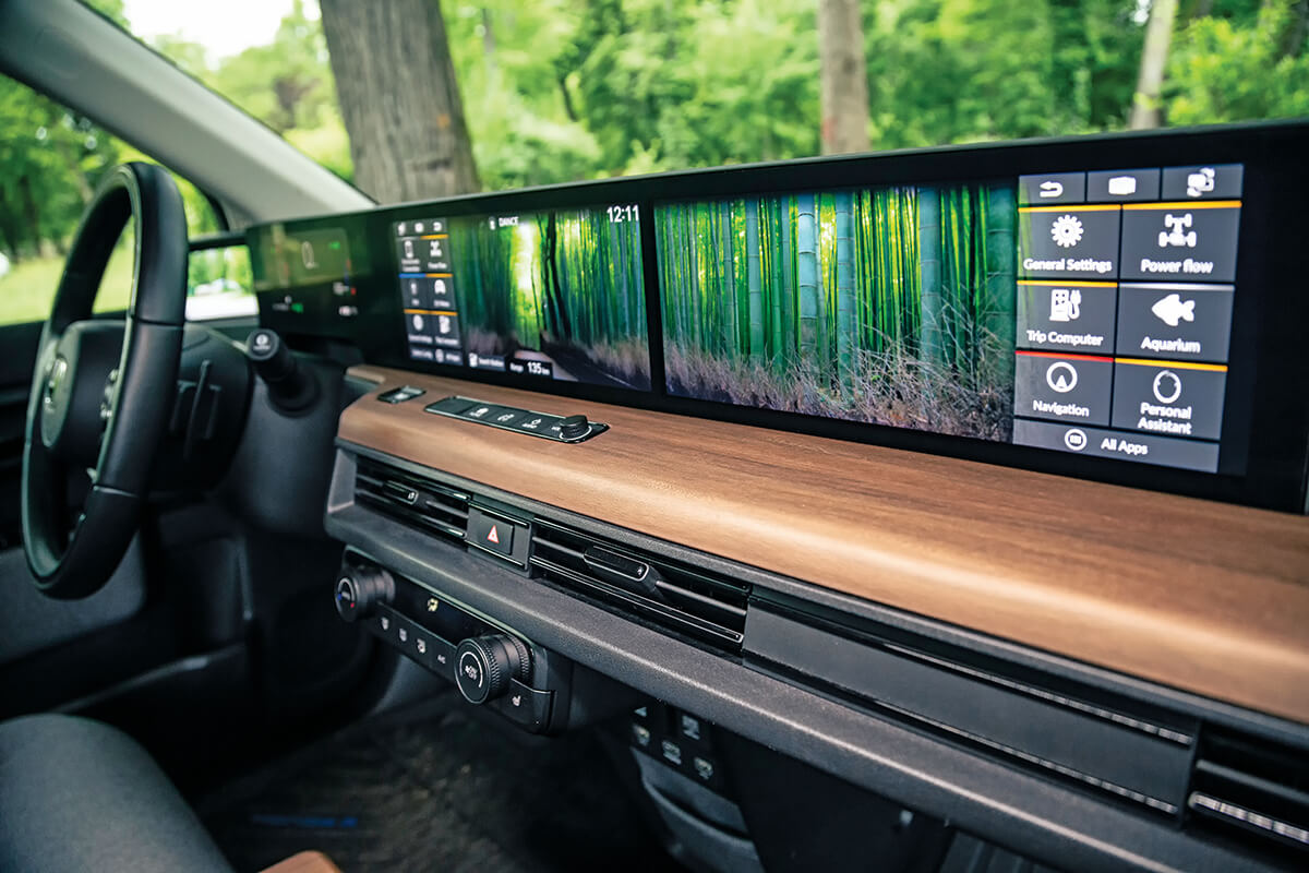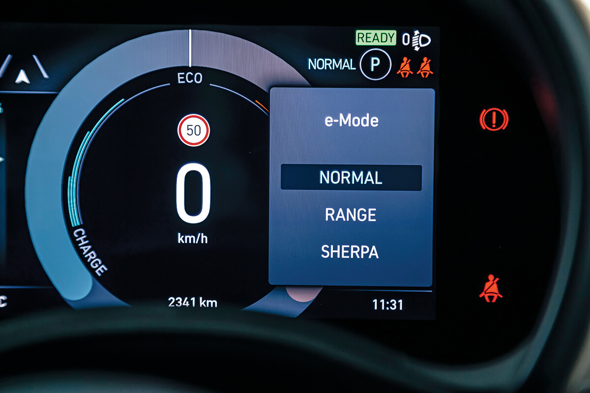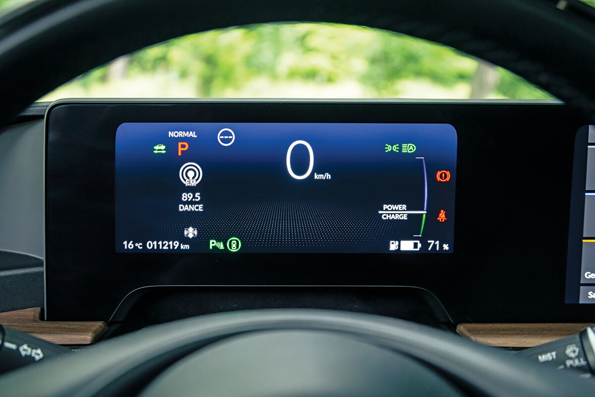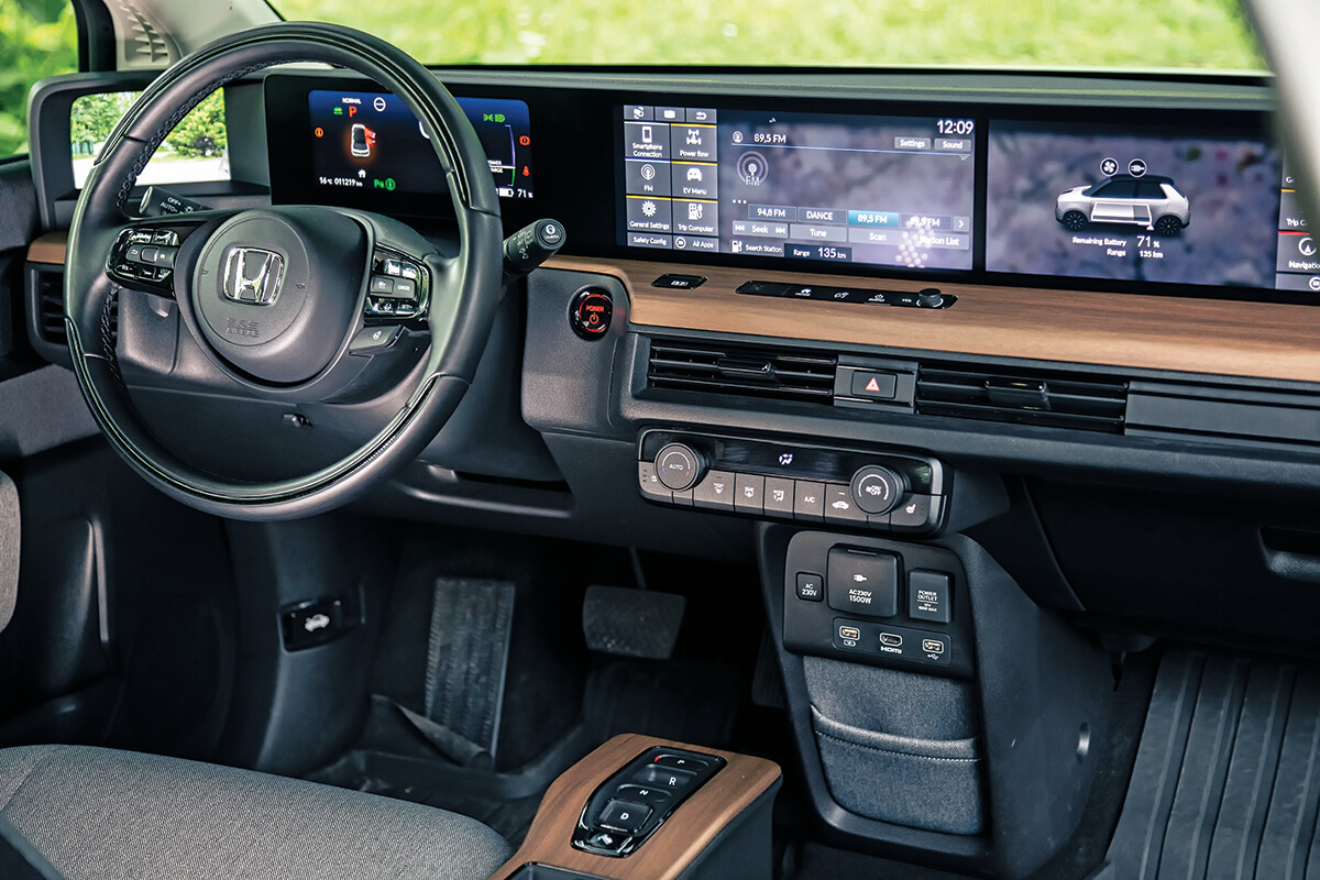 Raportat la bordul lui 500 electric, boem de simplu, cel al Hondei e pare că te invită să urmărești lansarea unei rachete NASA de la centrul din Cape Canaveral. 3, 2, 1… de fapt, cinci ecrane se înșiră pe toată lățimea bordului! Stai jos, ca într-o mașină sport, pe scaunul moale, de director al Departamentului de IT. Te bucuri de materiale și finisaje retro, în totală opoziție cu dotarea futuristă, de concept car. Imitația reușită de lemn de pe bord și de pe tunelul central, în combinație cu stofa de calitate de pe uși și scaune amintesc de epoca de aur a automobilismului, în care luxul nu se măsura în kilowați și kilobiți, ci, simplu, în senzație de bine.