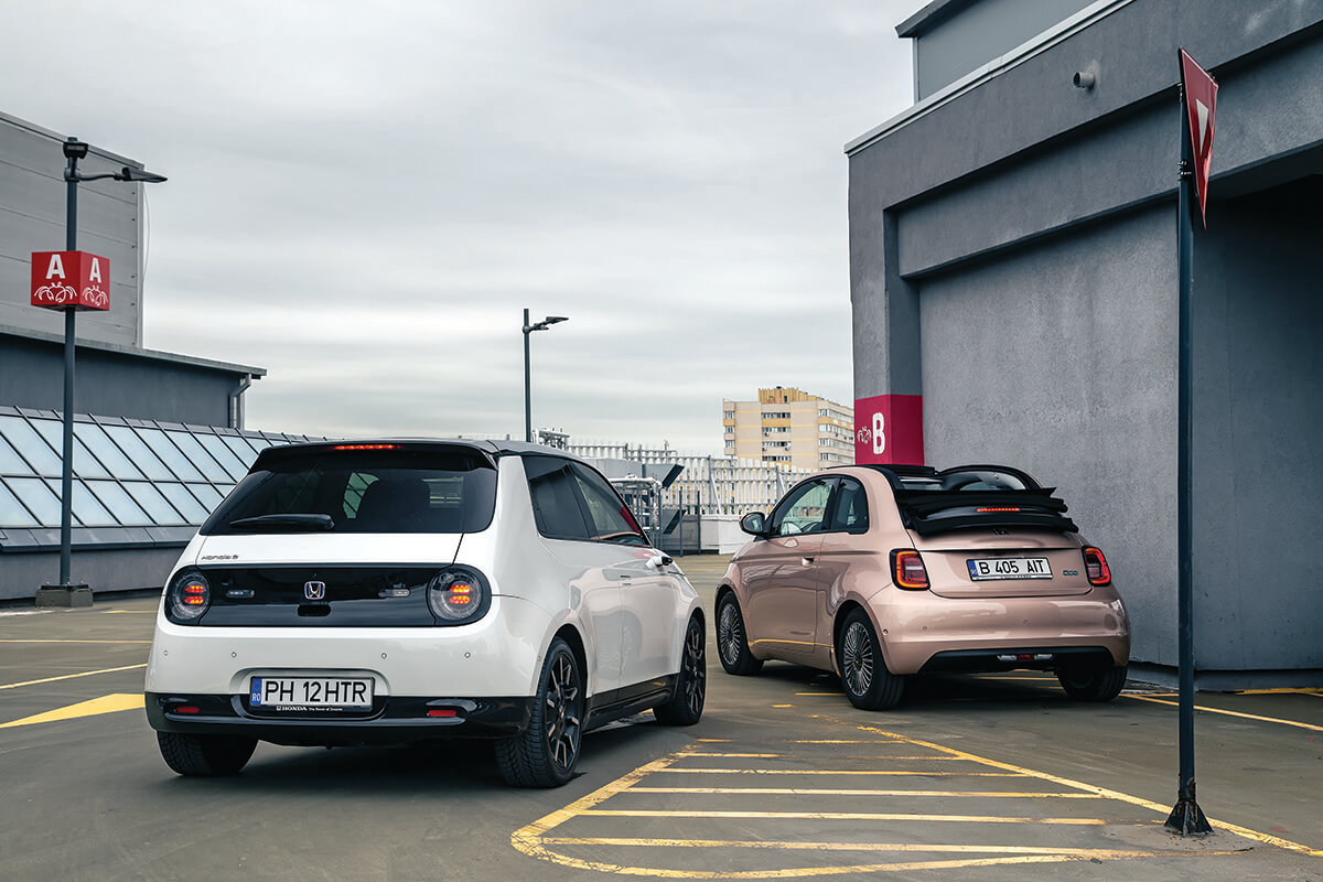 Manualul de istorie și-a schimbat aspectul. Însă, chiar dacă filele cu colțuri tocite aleator s-au prefăcut în fișiere reci, iar literele cu miros pregnant de tipar au devenit cod binar inodor, informația cuprinsă între coperți nu și-a pierdut esența. Fiat 500e vs Honda e. Foto: Bogdan Paraschiv