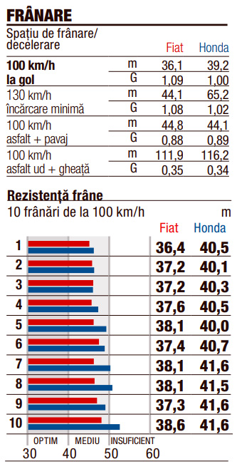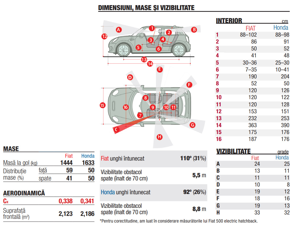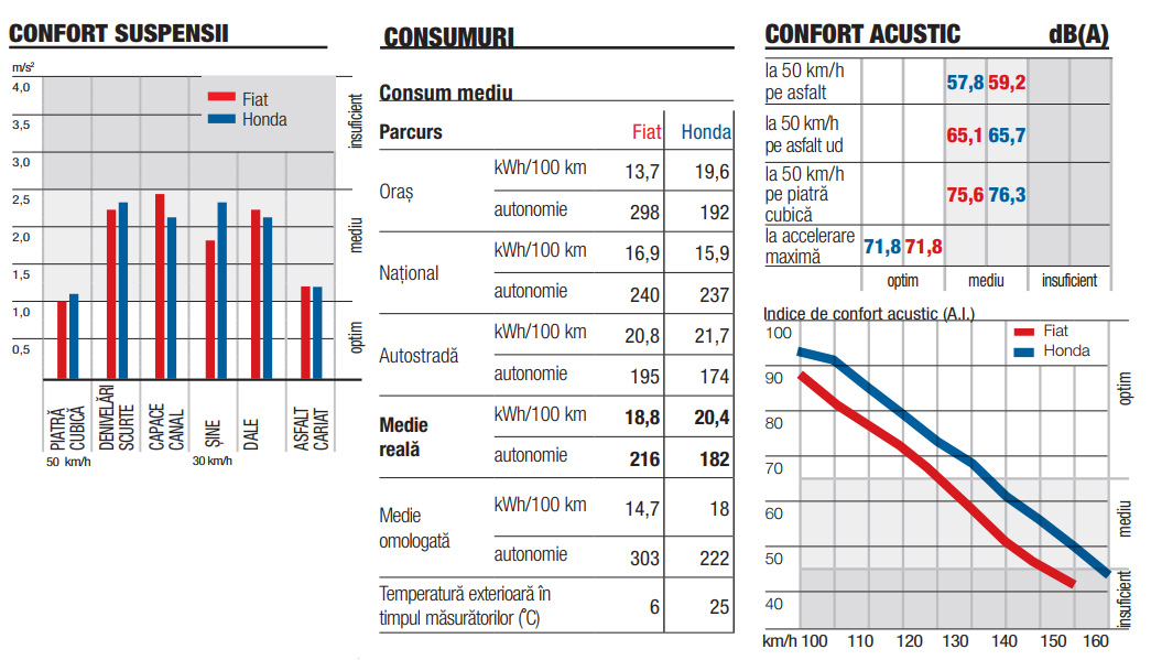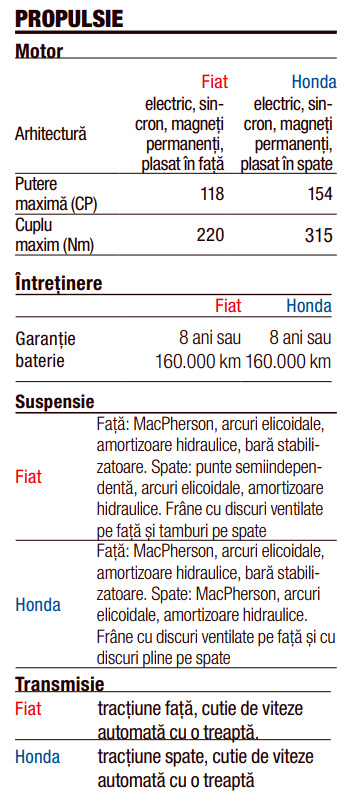 Poți lăsa și mașina să zburde, cuplând modul Sport, un mod pe care boemul 500 electric nu-l are. Însă nici nu-i trebuie – italianul e agil prin definiție. Chiar și în Sport, demarajele și reprizele Hondei sunt surprinzător de apropiate de ale Fiatului. Doar senzațiile diferă. La limită, japoneza pare mai nervoasă și glisează ușor cu spatele când o provoci. Italianul are o direcție și o suspensie mai sportiv reglate, în detrimentul confortului. Honda se simte mai comodă, iar Fiatul, mai exact.