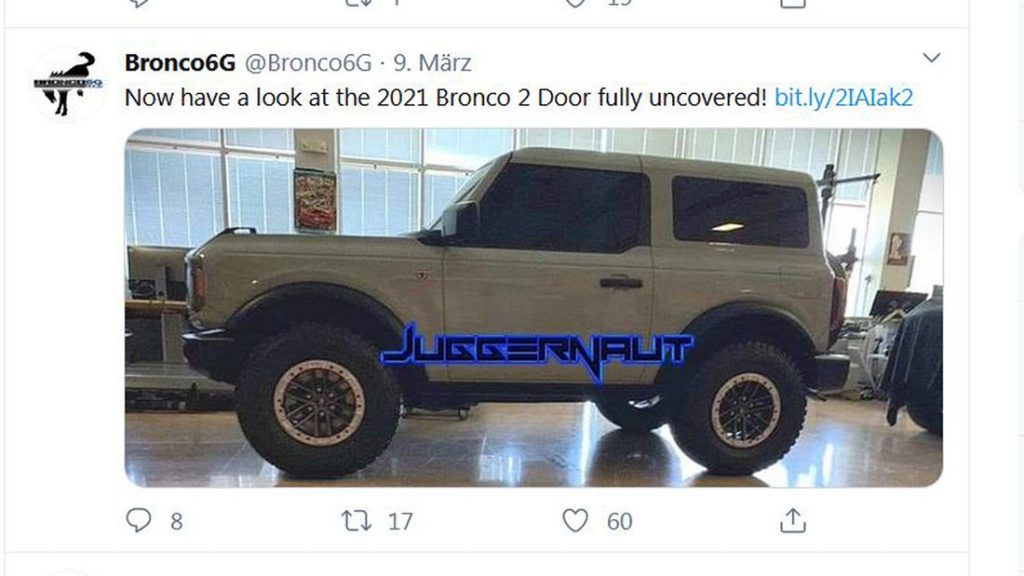 Datorită interesului major pentru acest model pe piața nord-americană, câteva imagini de pe linia de producție au ajuns pe internet. Viitorul model va fi produs atât în versiune cu două portiere, așa cum era cunoscut modelul Bronco, cât și într-o versiune cu patru portiere. Va exista și o versiune mai compactă numită Bronco Sport.