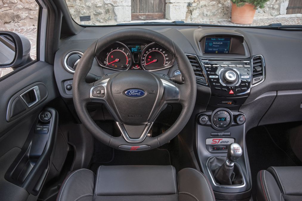 Povestea începe în secunda în care zărești pentru prima oară mașina. Culoarea Storm Grey, unica variantă disponibilă pentru caroseria Fiestei ST200, dă de bănuit oricui că nu are de-a face cu un model comun. Ea este susținută de grila față cu elemente în formă de fagure, de barele de protecție cu prelungiri tipice variantelor sport, de jantele negre, cu diametru de 17 inch și de eleronul prelung, cu rol funcțional. Situația se păstrează și la interior, unde volanul, schimbătorul de viteze și pedalele sunt inscripționate cu sigla ST. În zona inferioară a consolei centrale se află o plăcuță cu aceleași inscripții, iar pe prag, la deschiderea portierelor, sigla luminează cu roșu. Habitaclul este însă în cea mai mare parte negru, de la plastice la tapițerie și plafon, fapt care-i va bucura pe conservatori, dar nu-i va entuziasma pe tineri.