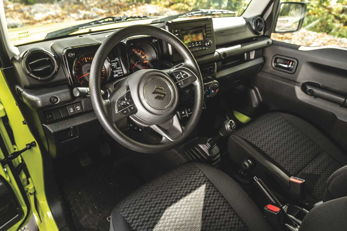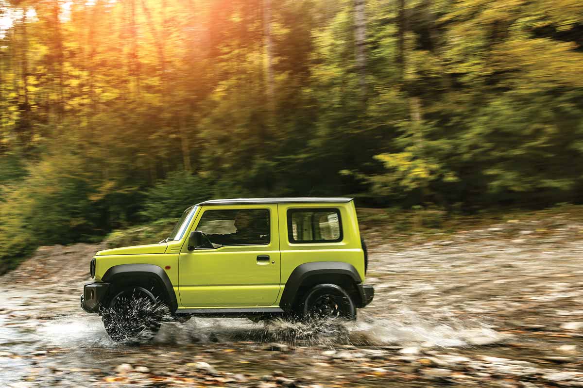 Cel mai dur model din gamă, Jimny, este unul dintre cele mai capabile off-roaderuri aflate la vânzare. Sistemul său de tracțiune integrală este nepermanent, șoferul putând comuta de la bord din 2WD, caz în care doar puntea din spate e motoare, în 4WD și 4WD Low. Nu există diferențial central, ci doar o cutie de transfer, astfel că între punți există o legătură rigidă. Se poate cupla din 2WD în 4WD și în mers până la 100 km/h, dar pentru cuplarea în 4WD Low este necesar ca mașina să fie în repaus și maneta schimbătorului, poziționată în N. Adaugă acestui sistem un șasiu separat, garda la sol de 21 cm și unghiurile de atac/ventral/degajare de 37/49/28 de grade și ai imaginea unui tot-teren care poate aborda fără mare efort cele mai dificile zone din off-road.
