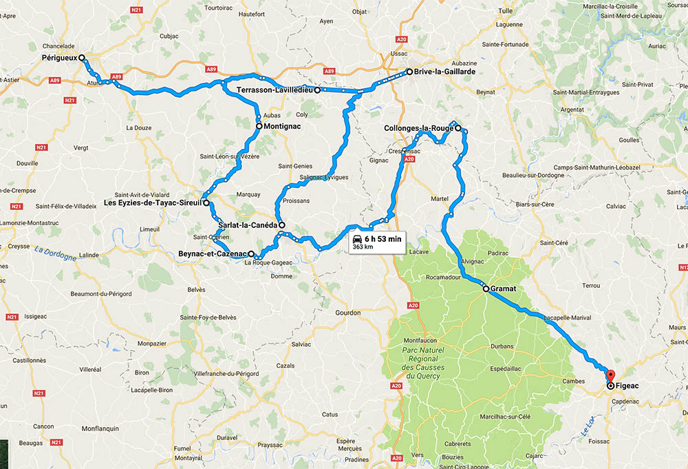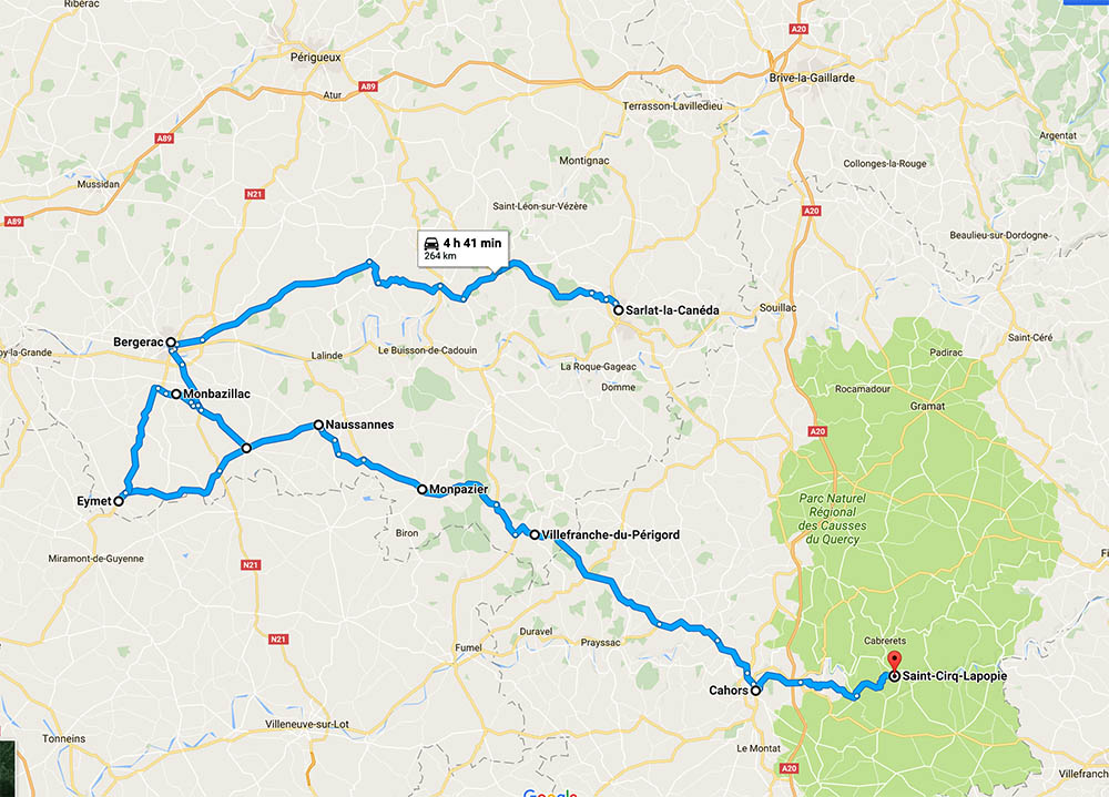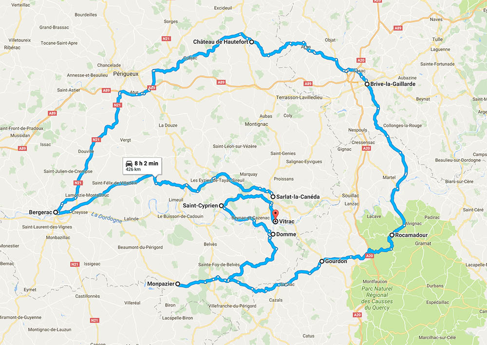N-am avut niciun plan bine pus la punct în ce privește traseul. De la aeroport, imediat după ce am luat mașina, ținta era locația de cazare în Sarlat-la-Canéda, 220 de kilometri mai departe. În puține cuvinte, zona pe care am vizitat-o este plină de puncte de interes. Castele ca-n poveşti, peşteri (Lascaux), parcuri, oraşe medievale, râuri de coborât în kayak dar şi vinuri şi o gastronomie de nu-ți ajunge o viață de om să le vezi şi să le guşti pe toate, darămite două săptămâni. Spre norocul meu, autostrăzi în zonă sunt, dar nu prea ai nevoie de ele dacă nu eşti grăbit spre serviciu.
