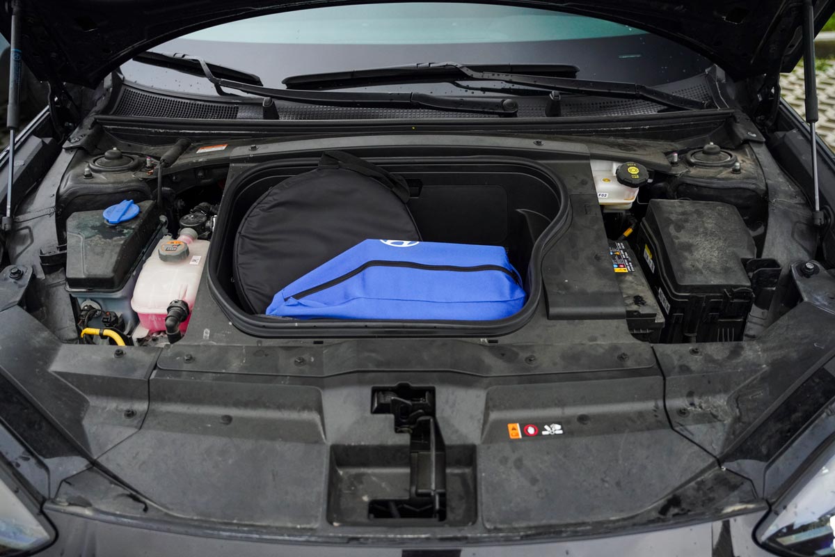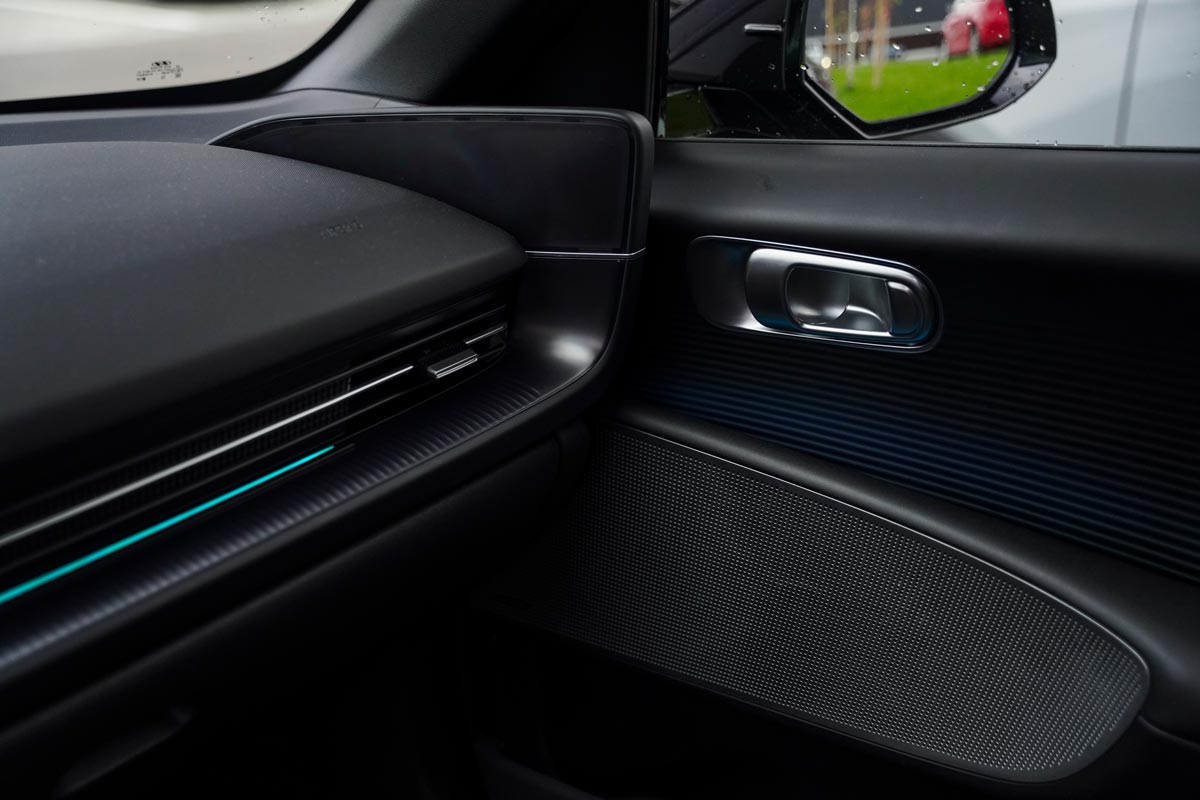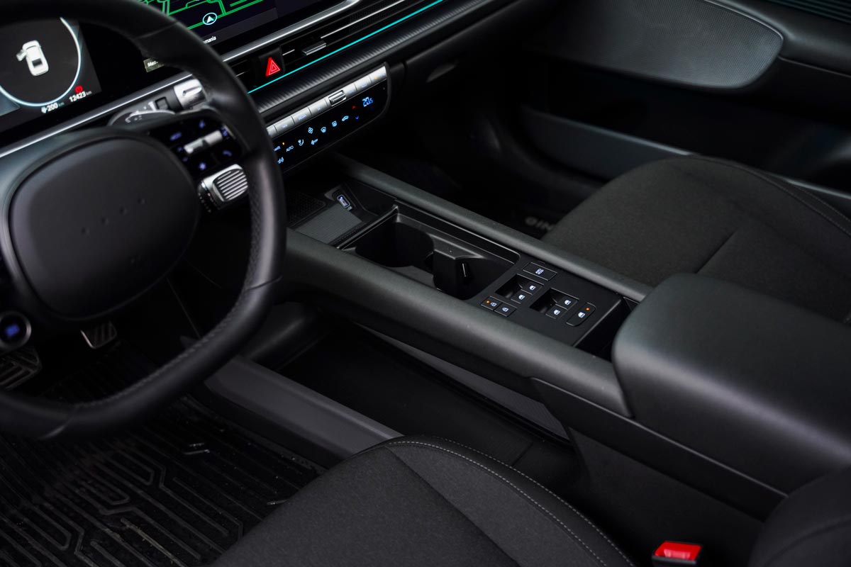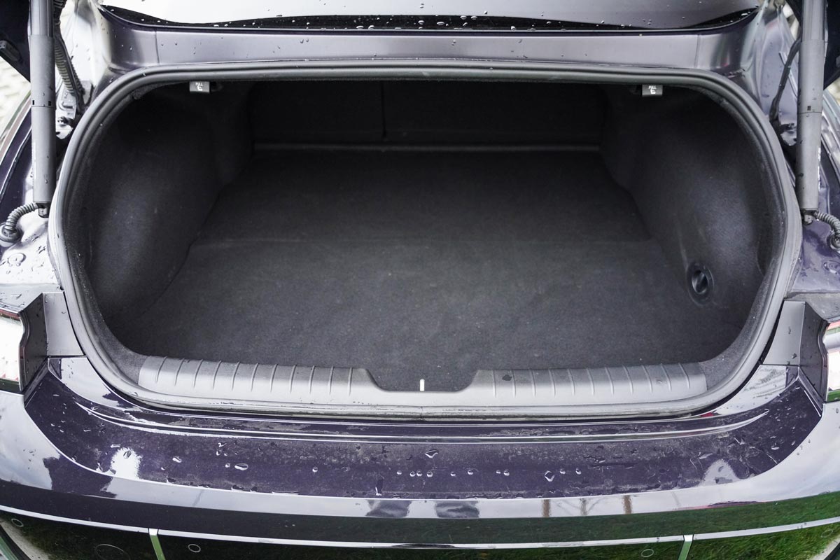 Spațios la picioare. Lungimea interioară este uriașă, chiar mai mare decât la Skoda Superb! Nici Taycan nu oferă un asemenea spațiu. Când călătorești pe banchetă, atingi cu capul plafonul dacă ai peste 1,83 m înălțime. Per total, atmosfera e cam ternă, din cauza culorii negre a cărei monotonie nu e ruptă de nicio altă nuanță, și a plasticelor cam tari. Dacă vrei să ți-o comanzi, fă tot posibilul să optezi pentru varianta cu interior în două culori.