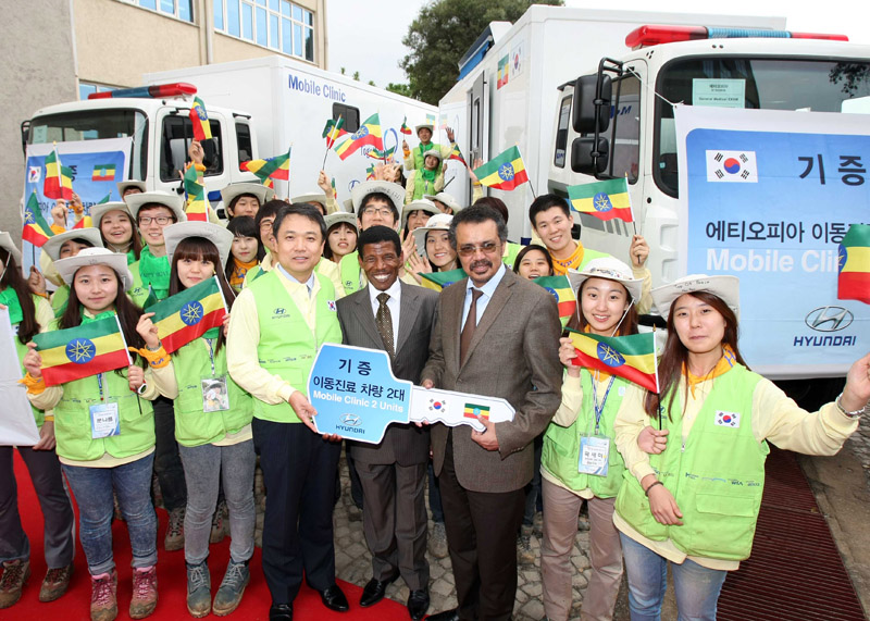 Initiativa s-a concretizat astazi la Addis Ababa, capitala Etiopiei, prin incredintarea a doua clinici mobile complet dotate de catre Hyundai ministerului sanatatii etiopian. La ceremonia organizata au participat Ministrul pentru Afaceri Externe coreean, Dl. Kim Sung-Hwan; Ambasadorul Coreeei in Republica Federala Democrata Etiopia, Dl. Chung Soonsuk; Ministrul etiopian al sanatatii, Dl. Tedros Adhanom; Presedintele Hyundai Motor Company, Dl. Chung Jin-Haeng; si Presedintele Hyundai Marathon Motor Engineering, Dl. Haile Gebreselassie, alaturi de reprezentantii media si alti oaspeti.
