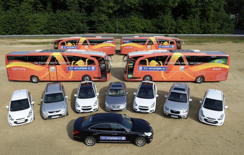 Hyundai ofera 289 de sedanuri, SUV-uri precum ix35, Santa Fe, ix55 si H1, plus 11 autobuze care poarta insemnele Hyundai destinate echipelor. Aceste vehicule vor fi folosite de catre oficialii FIFA, de echipele nationale, membri ai comitetelor de organizare, arbitri, oaspeti importanti si jurnalisti pe durata intregului eveniment, care se va desfasura intre 26 iunie si 17 iulie.