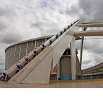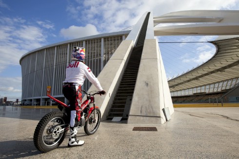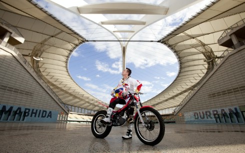 De 10 ori câștigător al Campionatul de Motociclism din Africa de Sud, Brian Capper, a traversat arcul stadionului Moses Mabhida din Durban, pe motorul său, sfidând legile gravitației.