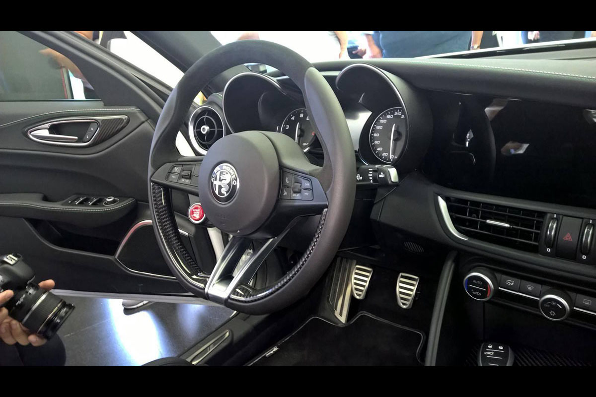 Scaunele sport, inserțiile de fibră de carbon precum și faptul că a fost singurul model prezentat până acum suferează foarte clar că ceea ce vedem sunt măruntaiele versiunii Quadrifoglio, iterarea sportivă a noii Giulia. Este greu și nedrept să tragi concluzii în baza unor simple fotografii neprofesionale, însă pe de altă parte dacă ar fi să ne facem o impresie, probabil că aceasta ar fi mai aproape de realitate decât cea bazată pe imaginile trase în studio, cu lumini, pregătire și machiaj…