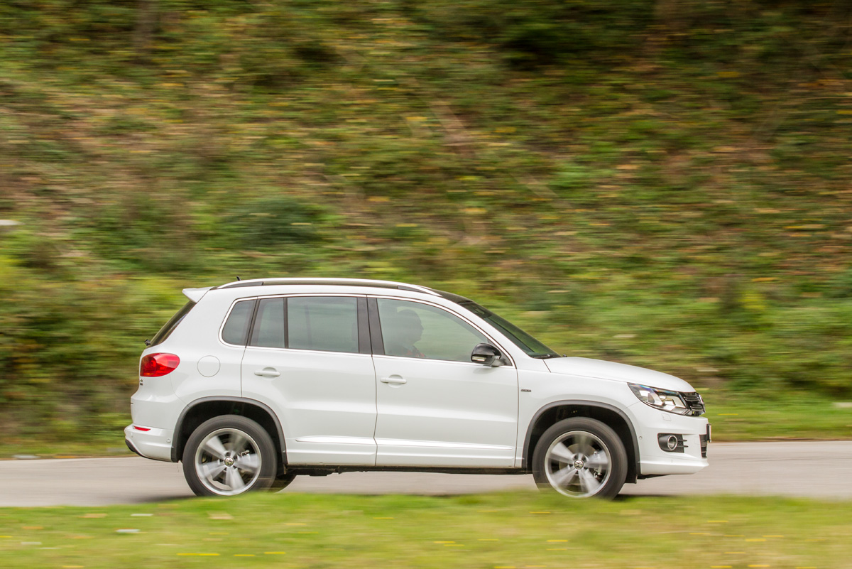 Lansat la finalul lui 2007 și cu un facelift în martie 2011, Tiguan este cel mai bâtrân din acest comparativ dar trenul de rulare este foarte actual deși se bazează pe platforma lui Golf V. Chiar și fără suspensia adaptivă la bord (836 de euro opțional, Tiguan este singurul care poate fi echipat cu suspensie adaptivă), trenul de rulare oferă un compromis foarte bun între confort și ținută de drum chiar și cu jantele de 18 inci oferite standard pe seria specială Cityscape derivată din echiparea R-Style. Inclusiv pe off-road, Tiguan rulează foarte confortabil, confortul suspensiei fiind de apreciat.