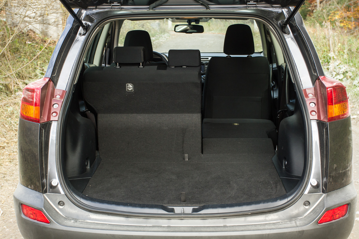 La prima vedere, noua Toyota RAV4 pare o mașină desenată pentru gusturile clienților de peste Ocean. Designul extravagant cu farurile subțiri care integrează grila radiatorului și stopurile masive care ies în afara caroseriei conferă un aer original și foarte american. De asemenea, față de vechea generație, lungimea a crescut cu 20 cm, ceea ce este destul de mult. Totuși, noul RAV4 nu este cea mai lungă mașină din test, Honda având o lungime identică, iar noul X-Trail fiind și mai lung. Totuși, Toyota a utilizat cel mai bine spațiul interior, spațiul în spate fiind cel mai mare din test. Practic, în spate, se stă la fel de aerisit ca într-o limuzină de clasă mare. De asemenea, tot tipic american, Toyota are cele mai mari scaune în față și cel mai lung șezut în spate. Fără îndoială, din acest punct de vedere, RAV4 este o ofertă atractivă pentru familii, mai ales că și volumul maxim al portbagajului este printre cele mai mari din test (1.746 litri). Nici volumul standard al portbagajului nu este de neglijat fiind aproape la fel de mare ca și cel al lui Honda (547 litri față de 589 litri la Honda). De asemenea, ca și la Honda, marginea de încărcare este joasă, bancheta se rabatează inteligent și se obține o suprafață de încărcare aproape plană, iar spătarul banchetei se poate înclina sub trei unghiuri diferite.