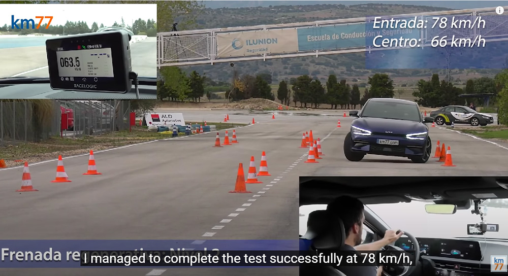 Cea mai bună încercare reușită a fost la 78 km/h, cu frânarea regenerativă pe nivelul 3 din 4. Această setare decelerează vehiculul ceva mai mult decât o frână de motor la un propulsor convențional. Se vede în clip unde se aprind stopurile de frână, semn că sistemul a intervenit la eliberarea accelerației. Reluarea procedurii cu regenerarea oprită a asigurat rezultate aproape la fel de bune. La viteze de peste 81 km/h, mașina a început să subvireze până la nivelul la care nu a mai putut fi controlată.