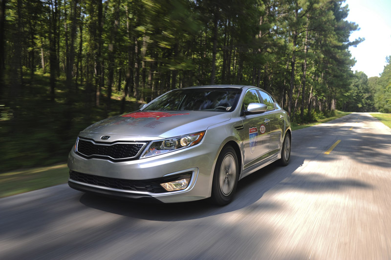 Soferii Wayne Gerdes din Wadsworth, Illinois, si Chris Bernius din New York City, au pilotat cu succes un exemplar de serie 2011 de Kia Optima Hybrid sedan pe o ruta de 12.712 km care a traversat America si au obtinut un consum mediu incredibil, de doar 3.64 l/100 km, mai scazut cu 61.37% decat consumul oficial EPA al masinii.