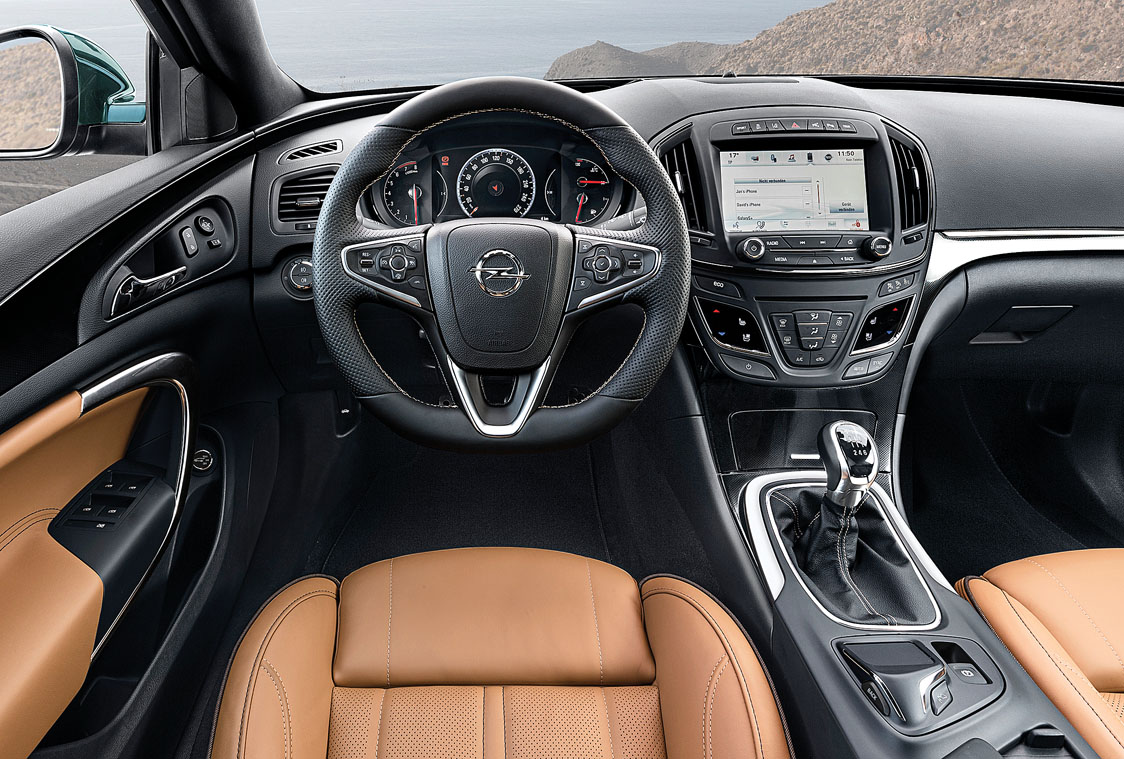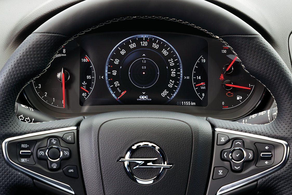 Dacă la exterior putem vorbi despre o evoluție rezervată, în interior cuvântul la ordinea zilei este revoluție. După nenumărate plângeri venite din partea presei de specialitate legate de numărul exagerat de mare de butoane ce popula consola centrală, Opel a reacționat și a scos la pensie abordarea „un buton pentru fiecare funcție“. Rezultatul este o planșă de bord care se remarcă în continuare prin masivitate, dar mult mai aerisită și mai elegantă, cu un ecran de 8“ pe post de actor principal (cel puțin în versiunile superioare de echipare). De parcă acest șoc vizual nu era suficient, designerii Opel au mers mai departe și au integrat taste capacitive pentru controlul climatizării și încă un ecran digital de mari dimensiuni în locul vitezometrului. Ca o compensație, o parte din butoanele pierdute au migrat pe volan, probabil că erau deja pe stoc și ar fi fost o risipă nejustificată. Lăsând gluma la o parte, odata cu trecerea în era digitală, Insignia primește și un sistem de infotainment modern denumit Intellilink ce poate fi controlat de șofer în patru modalități distincte: folosind un trackpad situat pe tunelul median, direct de pe ecran cu funcția touch, de pe volan sau prin intermediul comenzilor vocale.