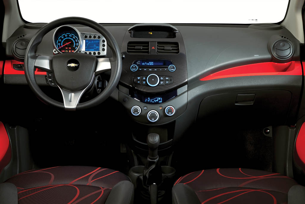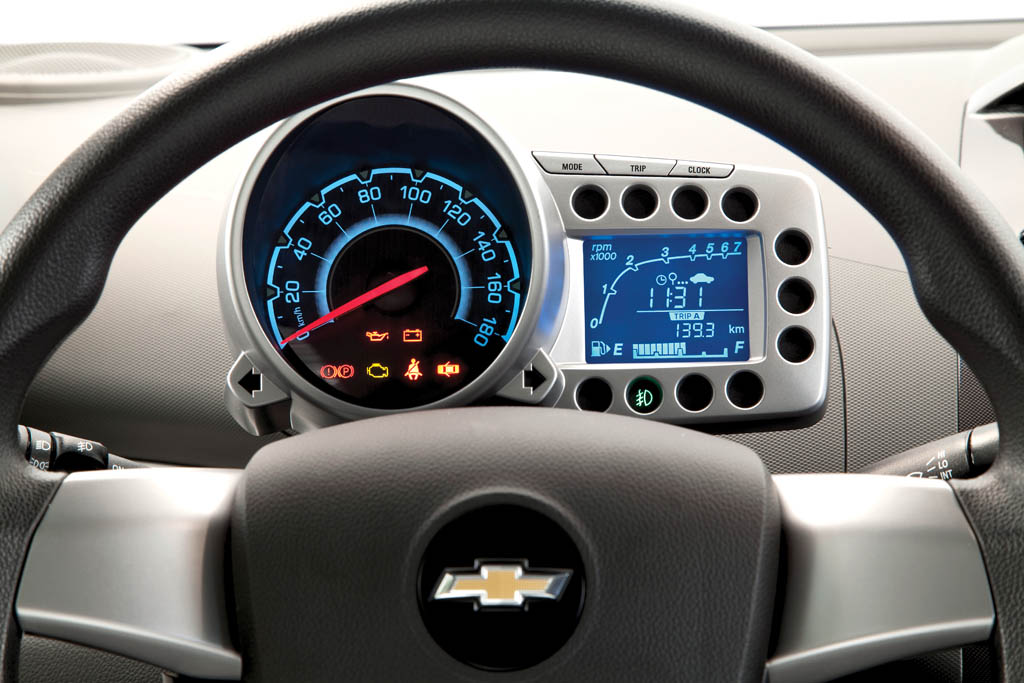 Primul lucru pozitiv pe care l-am remarcat în interiorului noului Spark a fost renunțarea la montarea centrală a cadranelor de bord. Această poziționare nu este neapărat un lucru rău, doar ca designerii Chevrolet de pe atunci au uitat să le și orienteze către șofer. Pe noua versiune vitezometrul a fost montat suspendat deasupra coloanei de direcție, iar în dreapta lui a fost plasat un display digital care afișează roțatiile pe minut și, în funcție de nivelul de echipare, informațiile computerului de bord. Până aici totul bine.
