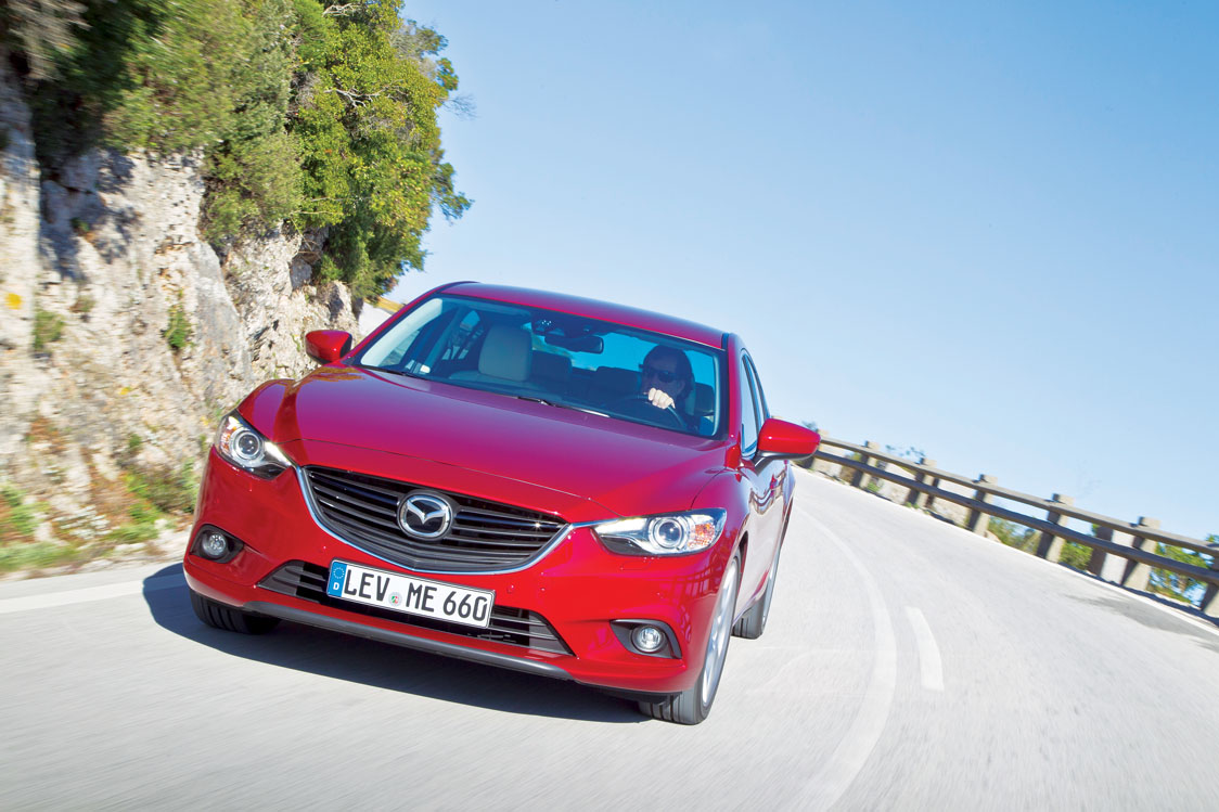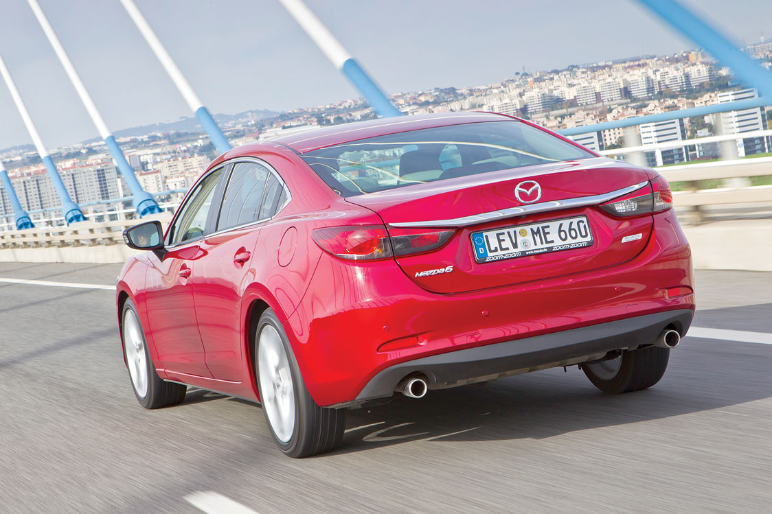 E greu de găsit un model concurent, care să aibă o prezenţă atât de complexă. Liniile agresive ale părţii frontale şi aripile din faţă bombate induc sportivitate, silueta simplă şi prelungă dă senzaţia de eleganţă, în timp ce elementele cromate din jurul grilei radiatorului şi de pe capacul / uşa portbagajului generează un aspect de lux discret. Mazda propune două maşini într-una – o berlină prelungă, ce pare teleportată dintr-un segment superior, pentru piaţa americană şi un break sportiv pentru Europa.