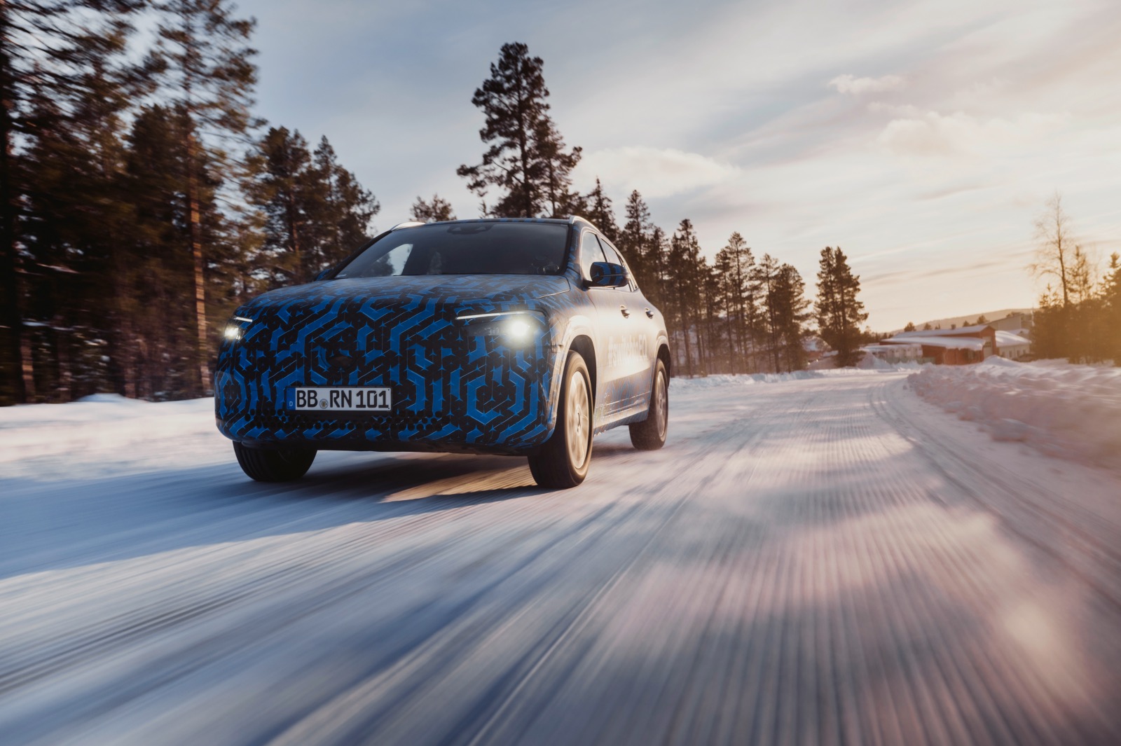 Mercedes-Benz EQA Prototyp auf Wintererprobung in Schweden rund um Arctic Falls. Mercedes-Benz EQA prototype during the winter test in Sweden around Arctic Falls.