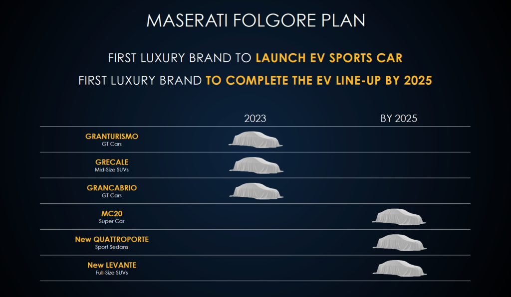 În planurile electrice Maserati mai există alte trei modele ce vor primi versiuni complet electrice până în 2025: supercarul MC20, următoarea generație a sedanului Quattroporte și SUV-ul Levante.