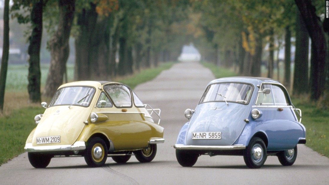 BMW Isetta. Un nume cât o istorie. 160.000 de astfel de micro-mașinuțe au fost produse între 1955 și 1962. Isetta avea doar 2,29 m lungime, două locuri și trei roți și intrai în mașină deschizând toată partea din față.