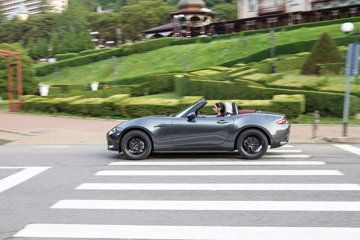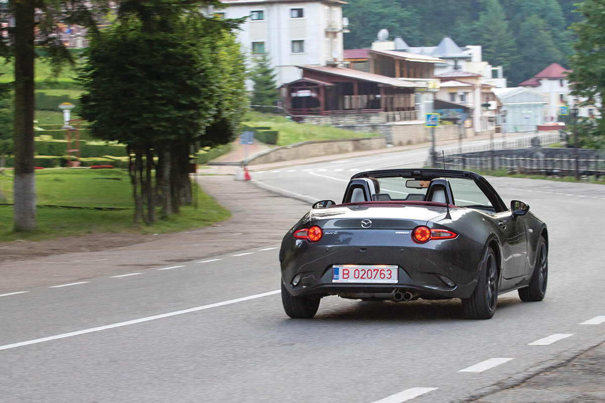 MX-5 eliberează adrenalina în sânge cu fiecare metru parcurs. Stau foarte jos, la numai 38 cm de șosea, și aproape de puntea din spate, care propulsează mașina, deci controlez perfect orice tentativă de supravirare. O simt ca pe un go-kart, dezbrăcată de orice artificiu inutil, pentru că cele 1100 kg distribuite în proporție de 53/47% pe punți se preling pe șoseaua sinuoasă cu o agilitate entuziasmantă. Încă o dovadă că greutatea mică bate puterea mare. Profit de lipsa traficului și îi descopăr limitele, care nu sunt deloc jos. Trebuie provocată explicit pentru a derapa, altminteri reglajele sunt atât de sportive, încât trasa este urmată cu sfințenie. Mai ales că motorul aspirat transmite cuplul progresiv, fără să pună la încercare reacțiile șoferului.