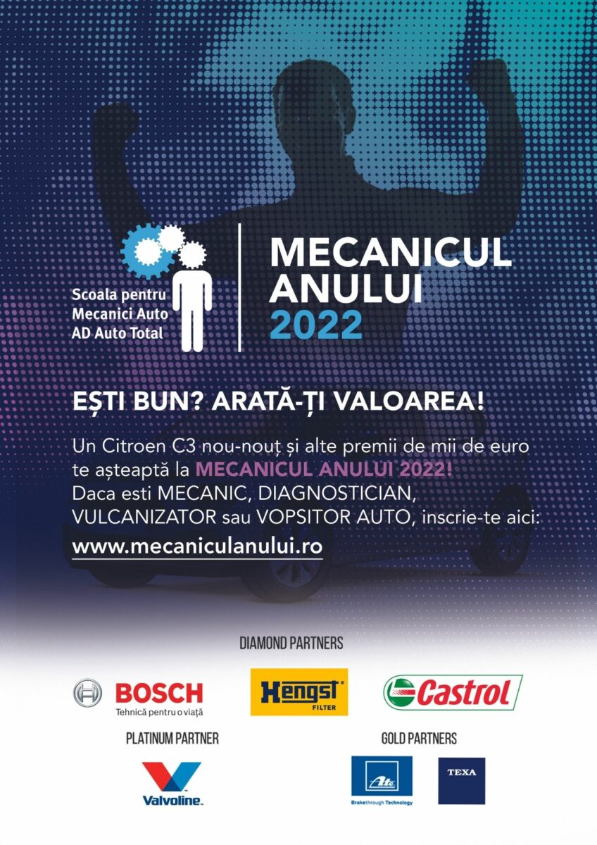 Au început înscrierile pentru cea mai populară competiție profesională din sectorul reparațiilor auto din România: MECANICUL ANULUI. Finala ediției 2022 are loc pe 12 noiembrie la GlobalWorth Tower în București. Marele premiu este o mașină Citroen C3, la care se adaugă premii în bani, cursuri de calificare sau alte surprize. Competiția se adresează oricărui pasionat de mecanică în vârstă de peste 18 ani. Preselecțiile se desfășoară la nivel național, iar înscrierile pentru etapa preliminară sunt deschise pe www.mecaniculanului.ro./ până pe 30 octombrie. Organizator: AD Auto Total.