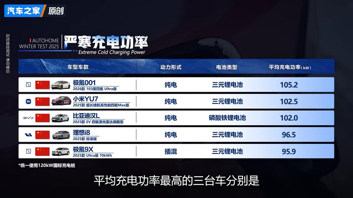 La testul de încărcare a fost folosită o stație de 120 kW. Rezultatele au relevat puteri medii de încărcare spectaculoase, de peste 100 kW, pentru trei modele chinezești: Zeekr 001, Xiaomi YU7 și BYD Song L.