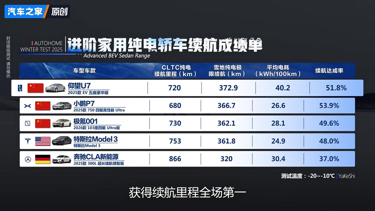 În aceste condiții, modelul care s-a apropiat cel mai mult de cifrele oficiale a fost Xpeng P7 (366,7 km), valoare echivalentă cu 53,9% din autonomia CLTC declarată (680 km). Doar Yangwang U7 a mai reușit să treacă de 50% din autonomia declarată (51,8%), având totodată și cea mai mare autonomie reală din test, 372,9 km. Pe locul 3 s-a situat Zeekr 001 (49,6%), cu o autonomie de 362 km.