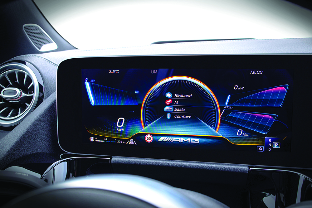 Și la bord este un adevărat spectacol. Grafica e diferită față de a unui GLA normal. Astfel, sunt trei moduri de afișaj pentru indicatoarele de bord: Classic, Sport și Supersport. Acestea pot fi schimbate oricând de la butoanele tactile din stânga volanului, în timp ce cele din dreapta operează sistemul multimedia MBUX. Opțional, GLA 35 oferă și AMG Track Pace. Acesta afișează harta și sectoarele unui anumit circuit și înregistrează 80 de parametri diferiți la turul pe circuit. O să vă dezamăgesc, dar nu puteți apela la AMG Track Pace dacă nu sunteți pe circuit. Sistemul e legat cu navigația și știe când sunteți sau nu acolo. Față de vechiul GLA 45 AMG, AMG GLA 35 e mai ieftin cu peste 10.000 de euro. Însă marele său avantaj este modul mai incitant în care se conduce.
