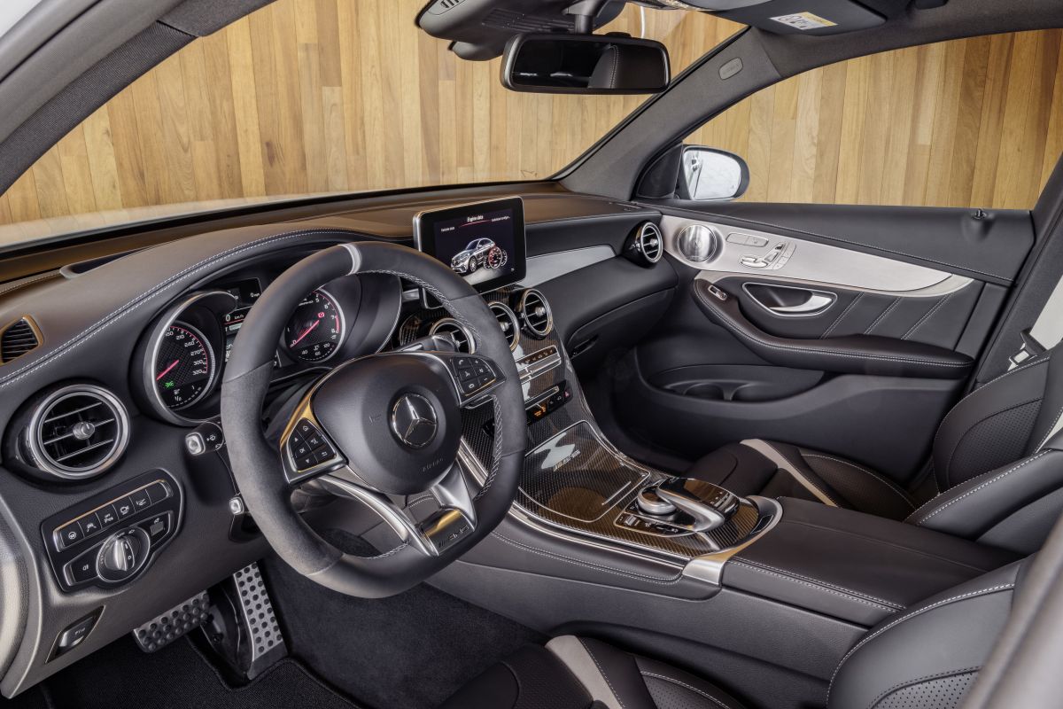 Interiorul lui Mercedes-AMG GLC 63 este, de asemenea, finisat pentru a fi în ton cu firea sa sportivă. Printre noutăți, scaune și un volan sport cu bază teșită, toate îmbrăcate în piele, logo-urile AMG embosate pe scaune, praguri sau consola centrală, instrumentele de bord cu design AMG, precum și elemente de decor sculptate în aluminiu și carbon natur.
