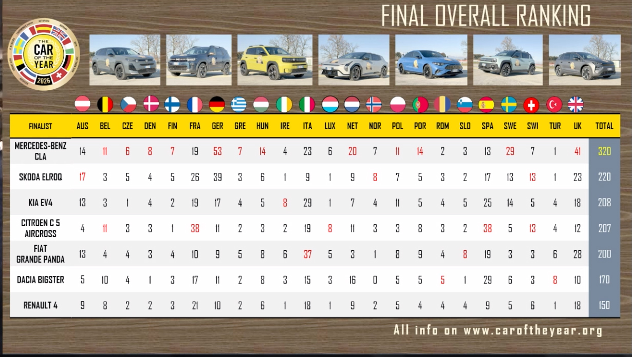 Trofeul Car of the Year 2026 a fost atribuit modelului Mercedes-Benz CLA. Acesta a reușit să strângă 320 de puncte, cu 100 peste al doilea model clasat, Skoda Elroq. Pe poziția a treia, cu 208 puncte, s-a poziționat Kia EV4. Vezi clasamentul final mai jos: