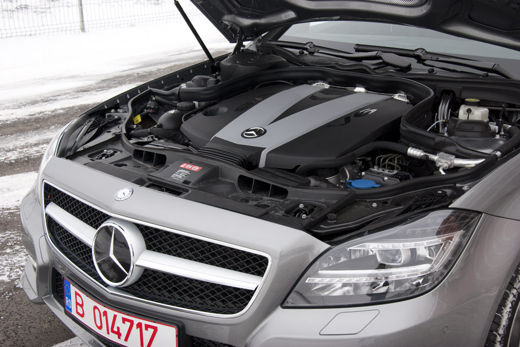 Tot aici trebuie menționat și radarul ce monitorizează permanent distanța dintre tine și mașina ce se deplasează în fața ta. Pe lângă afișarea unui martor în bord, calcutorul pregătește sistemul de frânare pentru o acționare de urgență. Aș putea continua, dar cred că aș avea nevoie de un număr special dedicat siguranței la bordul lui CLS.Un V6 diesel poate mulțumi o mare parte din clienții pretențioși. Oferă un cuplu cât un camion la turații mici, este atât de silențios încât la relanti ai impresia că este oprit, iar în sarcină nu scoate decât un vuiet metalic, înfundat.