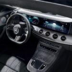 Pe lângă accentele de culoare neagră, ediția specială mai primește embleme Night Edition aplicate pe aripile față. La interior avem scaune tapițate cu piele Artico în culoarea neagră. Materialul se regăsește și pe planșa de bord. Opțiional, tapițeria poate fi din piele naturală, Nappa sau Alcantara. O serie de inserții de aluminiu completează interiorul modelelor E-Klasse Night Edition.