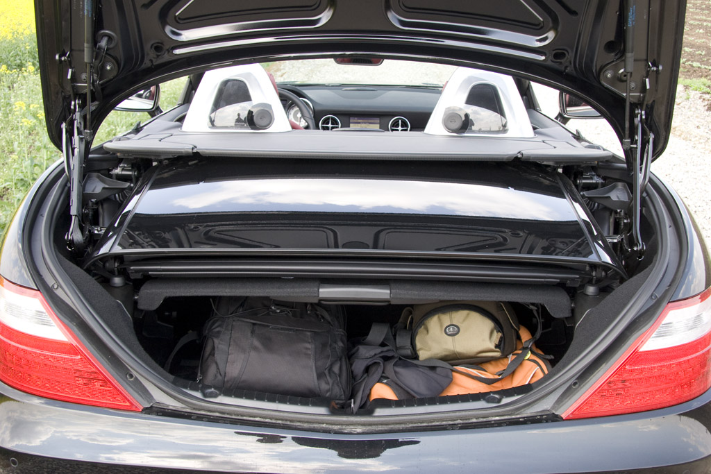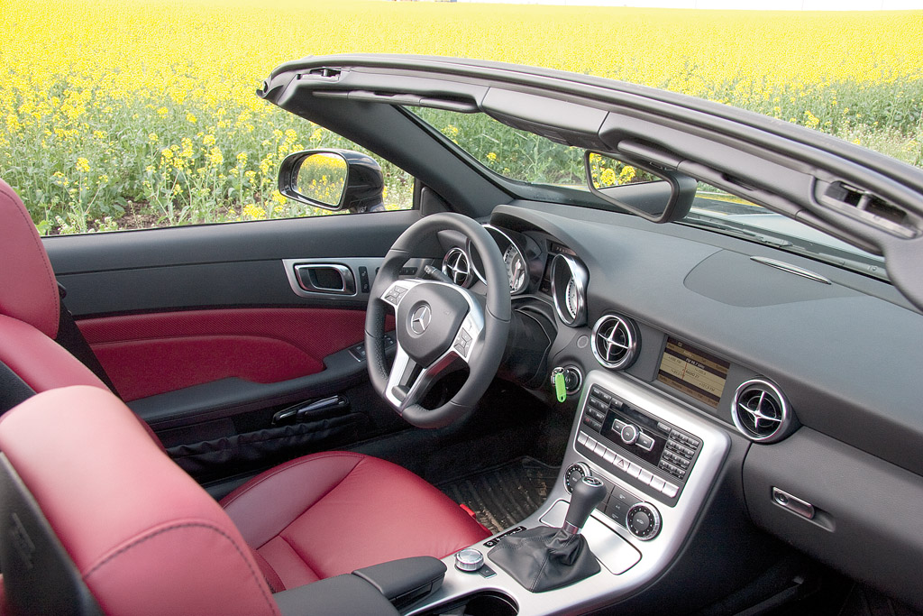 Cum era de așteptat, noul SLK respectă trendul „o inovație cu fiecare nouă generație“ și aduce în prim plan plafonul Magic Sky Control. Acest plafon își poate schimba gradul de opacitate în funcție de preferințele șoferului: complet transparent pentru o supradoză de lumină naturală, sau aproape negru dacă nu vrei linii în plus de bronz. Costă 2.467 de euro, cu aproape 2.000 de euro mai mult decât cel din sticlă obișnuită, așa că trebuie bifat cu răspundere. Sau, poți să renunți la toate bucățile de sticlă și să apeși pe butonul care decapotează mașina. Douăzeci de secunde mai târziu rămâi tu, tetiera care îți suflă aer cald în ceafă și cerul. Nu are rost să îți explic cum e, doar că până la 100 km/h totul este perfect, mai mult de atât turbulențele se fac simțite.