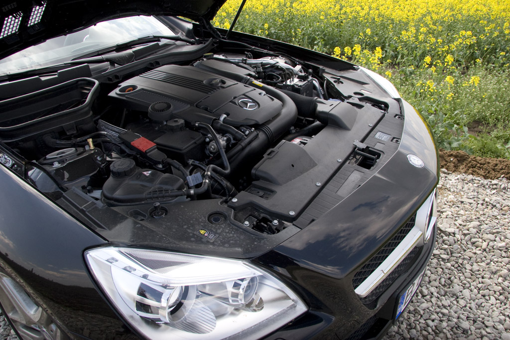 Noul SLK este disponibil cu trei motorizări, două ce au la bază un patru în linie de 1.8 l și una de vârf V6 de 3.5 l. Mașina din imagine a ales calea de mijloc cu indicativul 250, ce se traduce prin 201 CP produși de o unitata supraalimentată de 1.8 l. Nu sună foarte spectaculos, dar asta doar până când pornești motorul și timpanele tale se trezesc față în față cu ceva care sună ca un V6 aspirat.