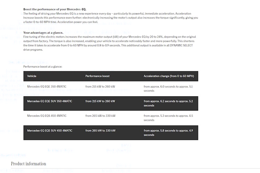 Pe site, Mercedes dă câteva exemple de îmbunătățire a accelerației. De asemenea, sunt publicate și valorile puterii. De exemplu, EQE 350 4MATIC dezvoltă fără opțiune 292 CP, iar după plata taxei 353 CP. Accelerația sa va scădea de la 6,0 la 5,1 secunde. Sau, la EQE SUV 4MATIC beneficiezi de același boost de putere, și câștigi fix o secundă (de la 6,2 la 5,2).