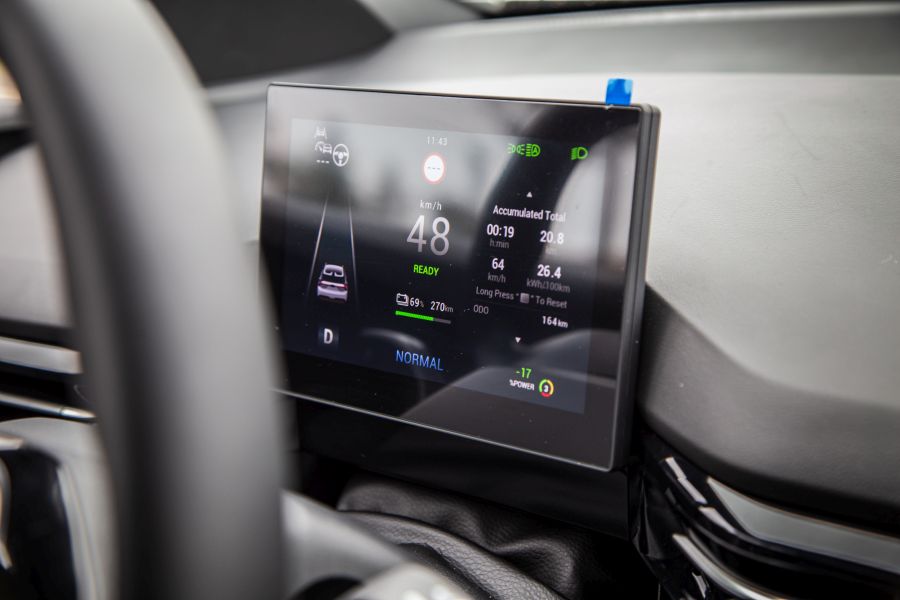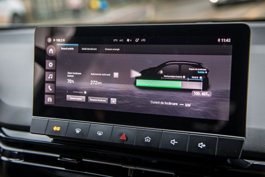 Puterea maximă livrată de motorul electric este de 170 CP, iar cuplul maxim de 250 Nm. Autonomia declarată este de 350 km. Pe un traseu de 30 km format atât din drum național, cât și autostradă, am reușit un consum de 22,4 kWh/100 km la o temperatură exterioară de aproximativ 4 grade. Viteza medie pe traseu a fost de 62 km/h.