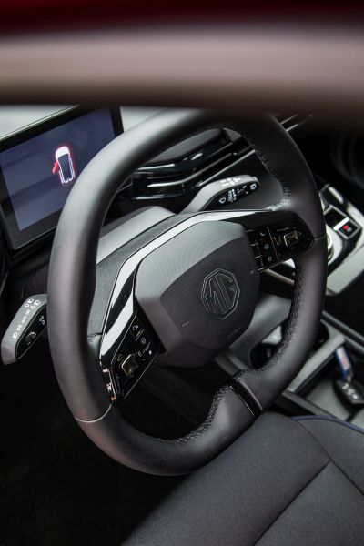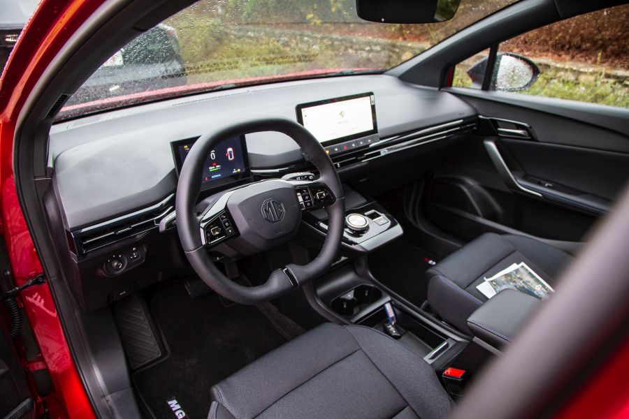 Înăuntru, MG4 aduce cu mașinile grupului VAG. Instrumentarul de bord digital de 7 inchi este foarte asemănător cu cel de pe ID.3. Volanul îmbrăcat într-o imitație de piele are o formă șic și este plăcut la atingere. Scaunele față din stofă sunt confortabile și oferă o susținere laterală bună. Pe banchetă pot călători confortabil fără probleme trei adulți. Volumul portbagajului de 363 litri este cu doar 22 l mai mic decât la ID.3.