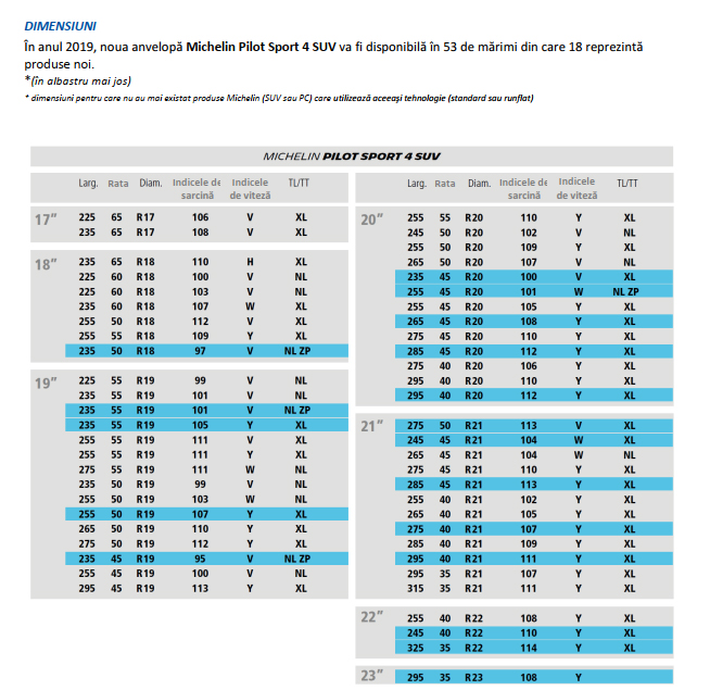 Ce dimensiuni sunt disponibile pentru Michelin Pilot Sport 4 SUV?