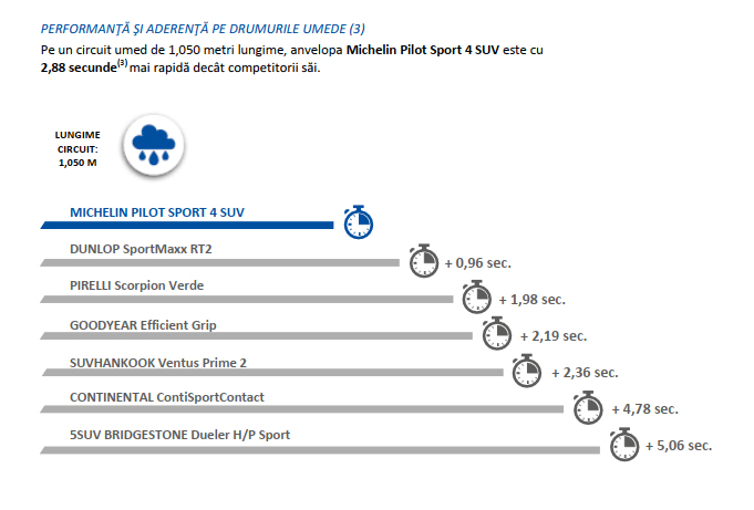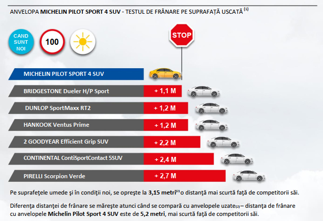 (1), (2), (3) Testele au fost desfăşurate de serviciul pentru produse TÜV-SÜD, la cererea Michelin, în luna septembrie 2018, pentru dimensiunea 235/60 R 18 107W pe Audi Q5 2.0 TDI.