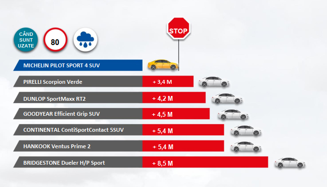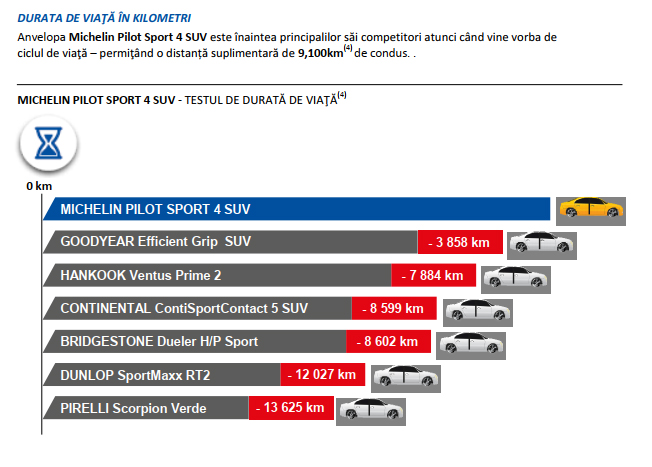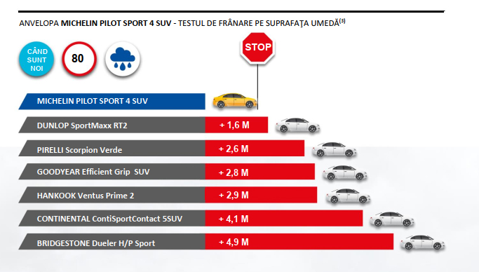(4) Test desfăşurat de DEKRA TEST CENTER, la cererea Michelin,între august 2018 şi septembrie 2018, pentru dimensiunea 235/60R18 107W pe Hyundai Sante Fe CRDi.