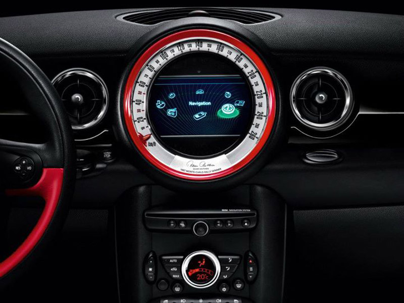 Interiorul a primit de asemenea o tușa de personalizare, prin adoptarea unor inserții roșii la nivelul cadranului central, volanului și pe portiere. Tot pe cadranul vitezometrului de dimensiuni generoase, caracteristic gamei MINI, tronează la loc de cinste autograful legendarului Rauno Aaltonen, amintind în permanență că avem de-a face cu un model cu adevărat special.
