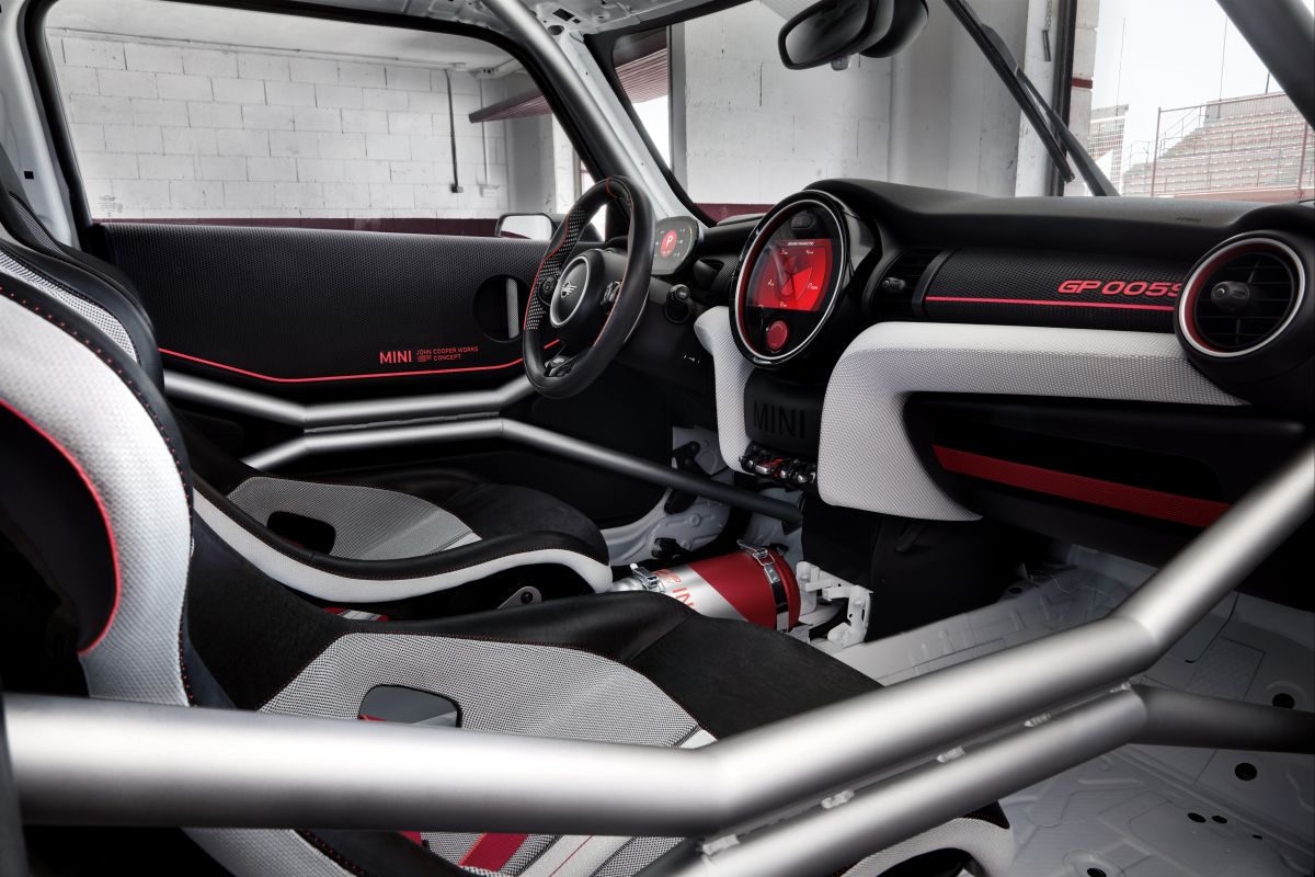 Deoarece conceptul a fost conceput pentru curse, interiorul a fost văduvit de toate echipamentele neesențiale de confort. Cu toate acestea, Mini a adăugat un roll-cage din aluminiu și două scaune de curse tip scoică cu centuri de siguranță cu prindere în cinci puncte. Se remarcă, de asemenea, instrumentele digitale de bord, acompaniate de un head-up display și de accentele 3D tricotate de culoare roșie, vizibile la nivelul planșei de bord, a fețelor de uși și a scaunelor.
