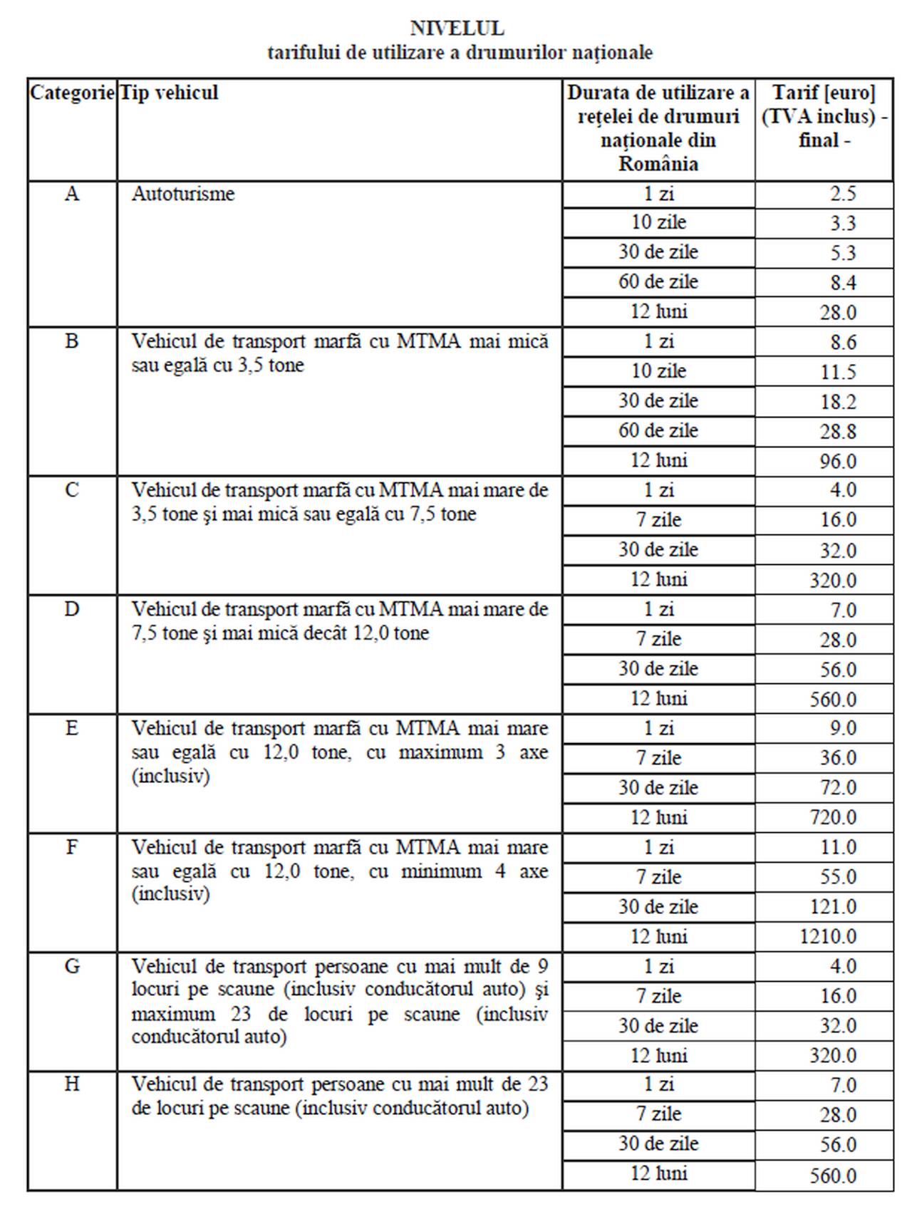 Totodată, pentru vehiculele de transport marfă cu MTMA mai mică sau egală cu 3,5 tone, tarrifele sunt de 8,6 euro pentru o zi, 11,5 euro pentru 10 zile, 18,2 euro pentru 30 de zile, 28,8 euro pentru 60 de zile sau 96 de euro pentru 12 luni.